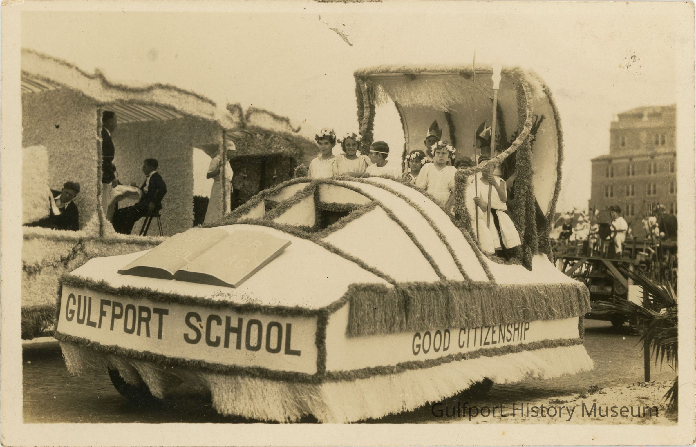 A black and white photograph postcard showing Gulfport School's float in the [1930/1936] Festival of States Parade. 9 children stand atop the float. The front reads "GULFPORT SCHOOL" and the visible left side of the float reads "GOOD CITIZENSHIP." Another larger float is next to it.Subject