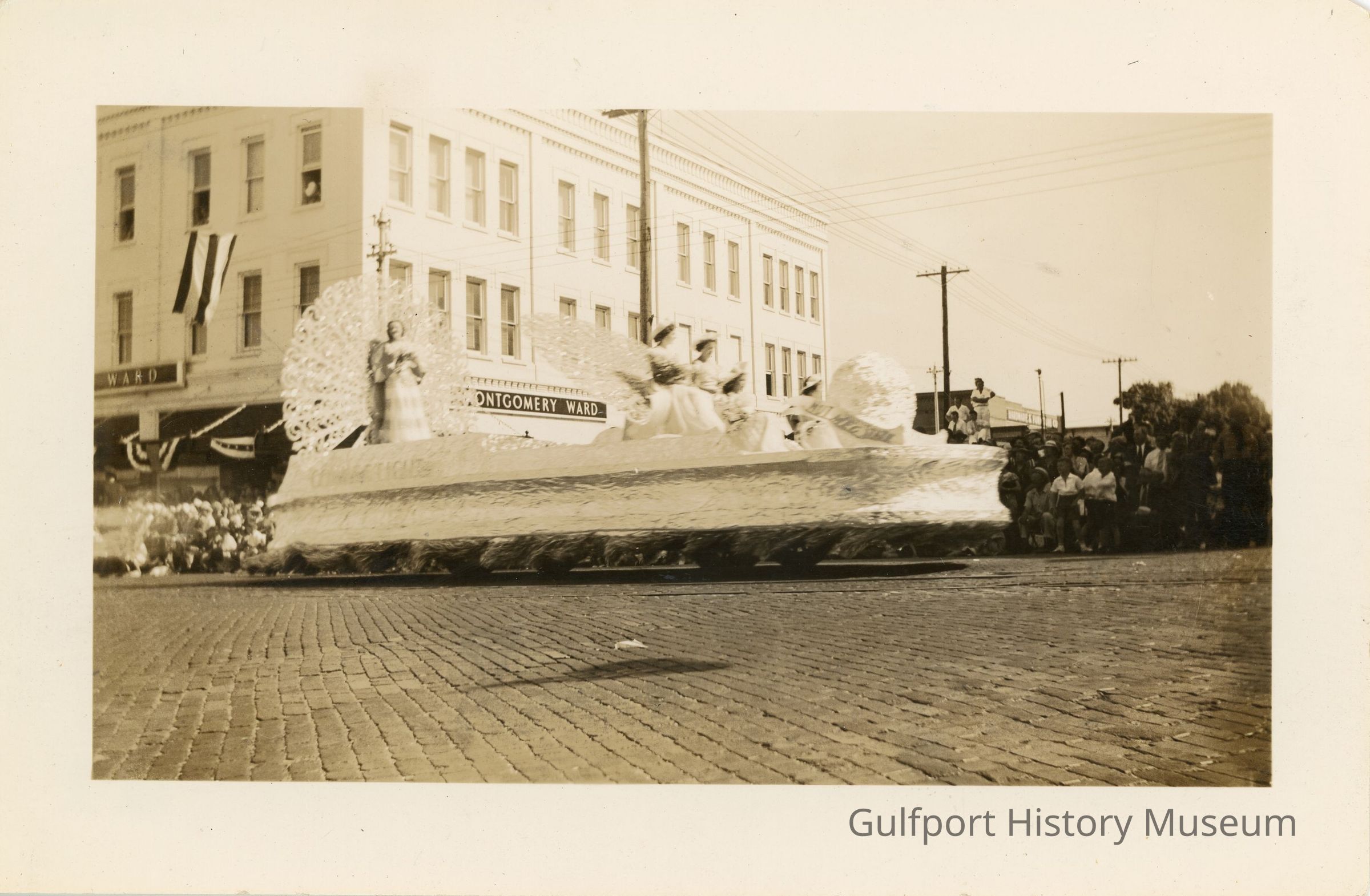 A black and white photograph of a float [in the [1936] Festival of States parade on Central Ave in St. Petersburg. The Montgomery Ward & Co. Retail Store is visible across the street. People line the street watching the procession.