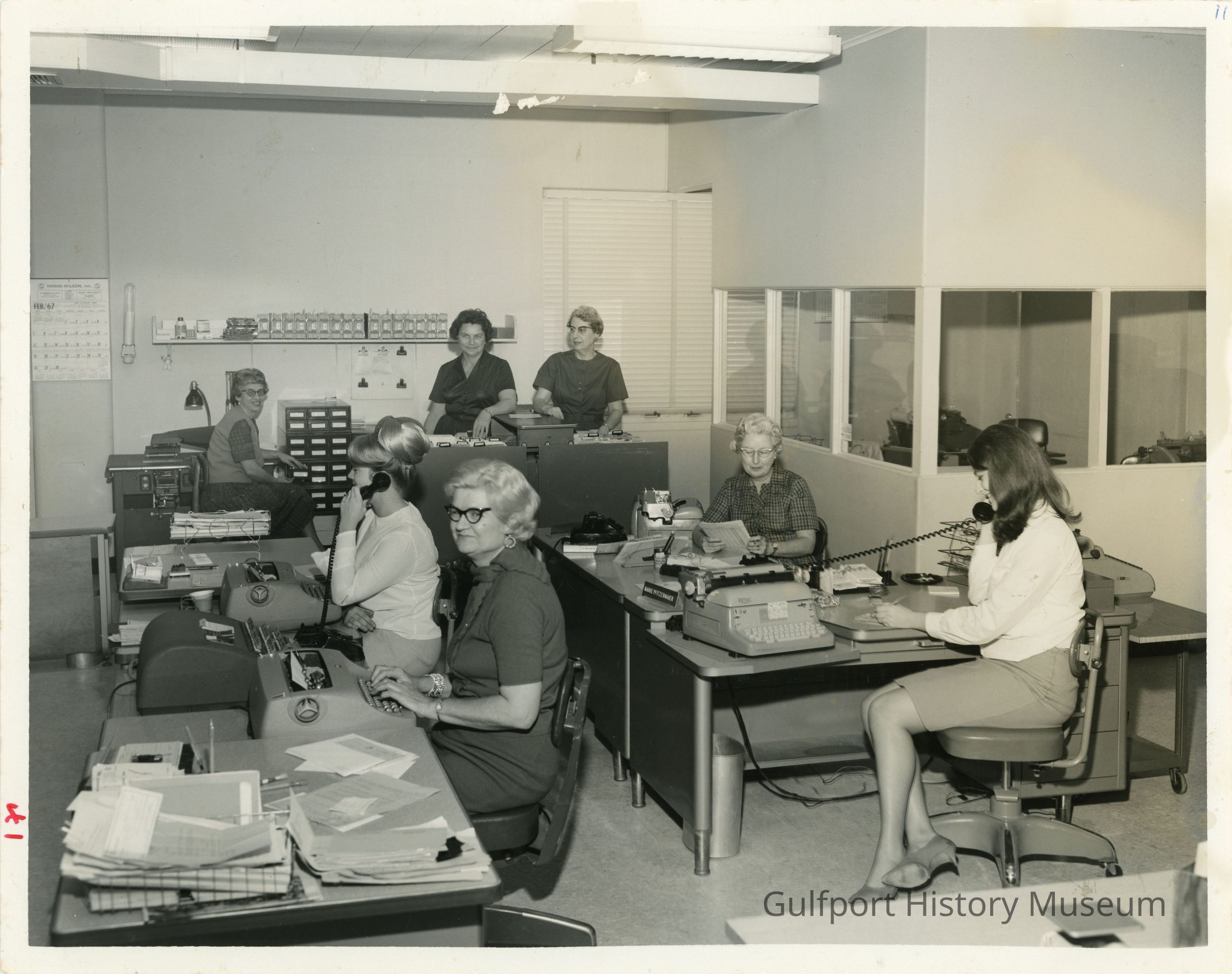 A black and white photograph of the [Finance Department] at Gulfport City Hall. There are seven women working in the office, two of which are on the phone. Five sit at desks with typewriters, while the remaining two stand by a filing cabinet. A corner office with windows is visible right of frame.