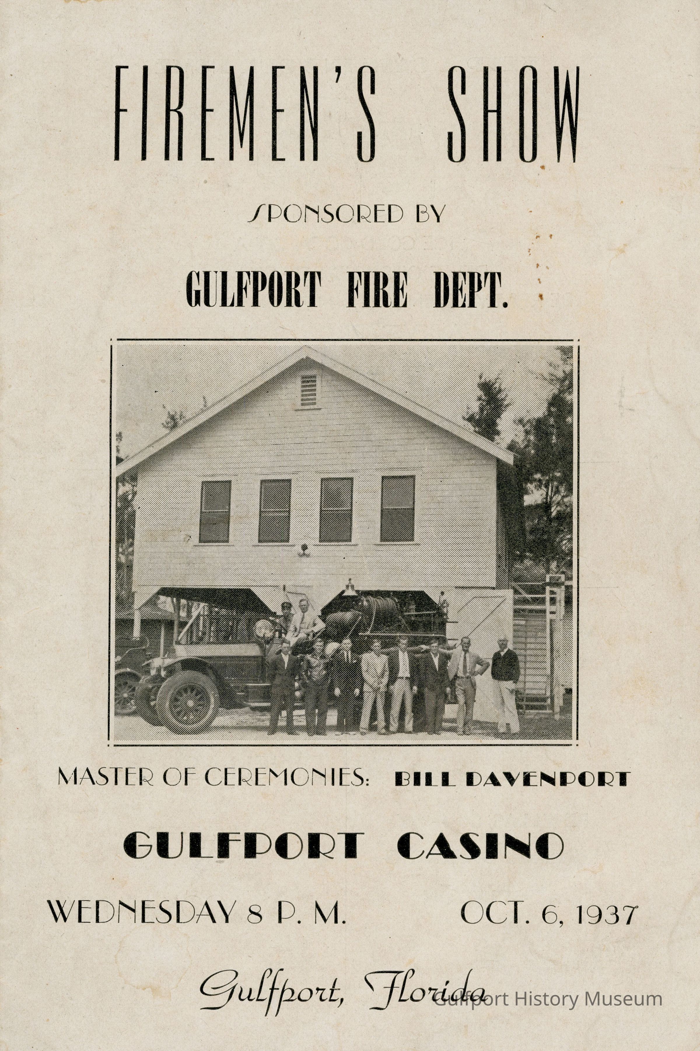 FIREMEN'S SHOW / SPONSORED BY / GULFPORT FIRE DEPT. / MASTER OF CEREMONIES: BILL DAVENPORT / GULFPORT CASINO / WEDNESDAY 8 P.M. OCT. 6, 1937 / Gulfport, FloridaTranscriber
