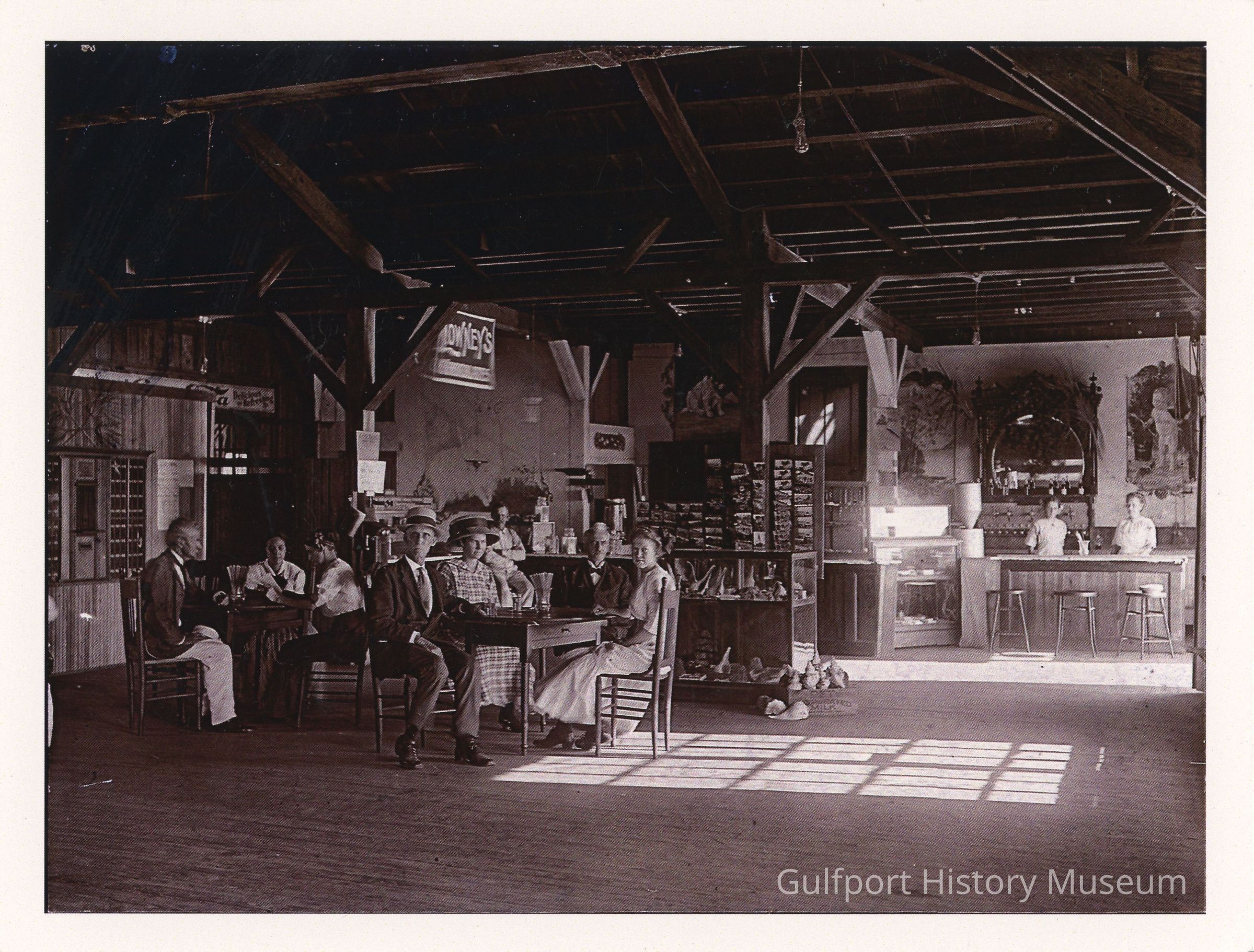 A black and white photograph of people sitting in the open air soda fountain at the first Gulfport Casino. A group of three are looking over what appear to be menus. A group of four are seated at the table beside them. There is one man standing by the bar and two women standing behind the counter in front of a large tap dispenser with a large circular mirror behind them. The soda fountain has items for sale in a large glass case, including large sea shells, magnets, and jewelry. There are large conch horns in a box labeled "EVAPORATED MILK." The floor is simple wood and the beams of the roof are exposed on the interior. Supporting beams can be seen throughout the open space. A sign that reads "LOWNEY'S CHOCOLATES" can be seen hanging from one of the beams, and a sign for Coca-Cola is barely visible on a wall.