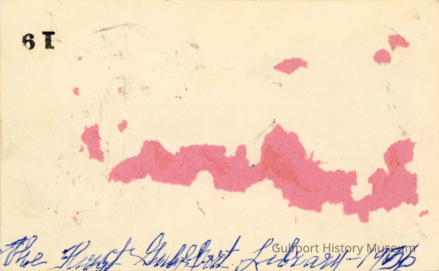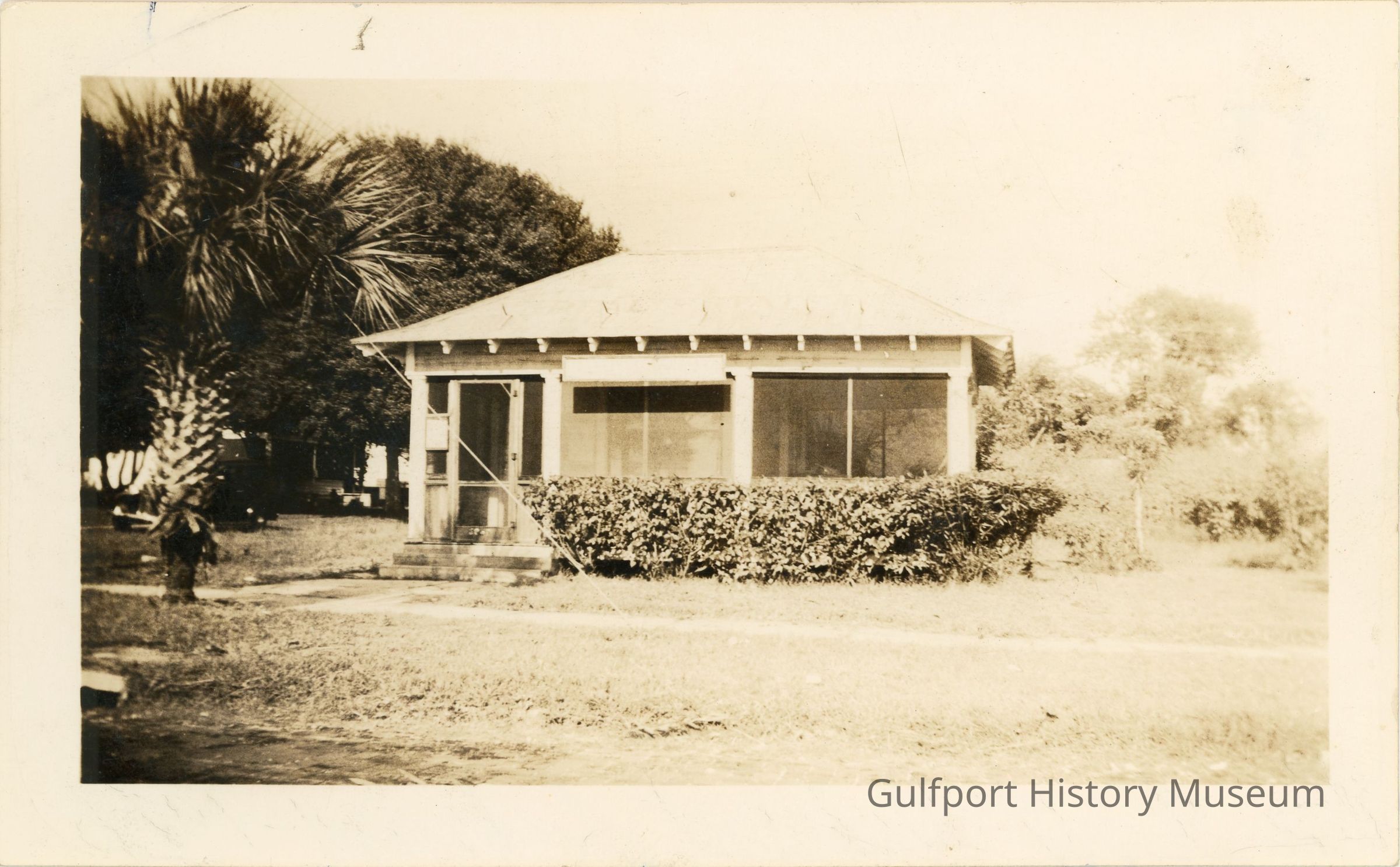 A black and white photograph of the first Gulfport Public Library. It is a small building, with a palm tree and several bushes in planted in front of it along a sidewalk. A former real estate office, the building was used as a temporary location for the library around the time of its creation.