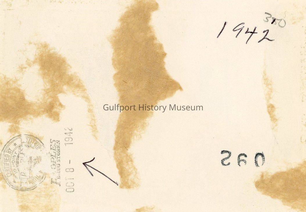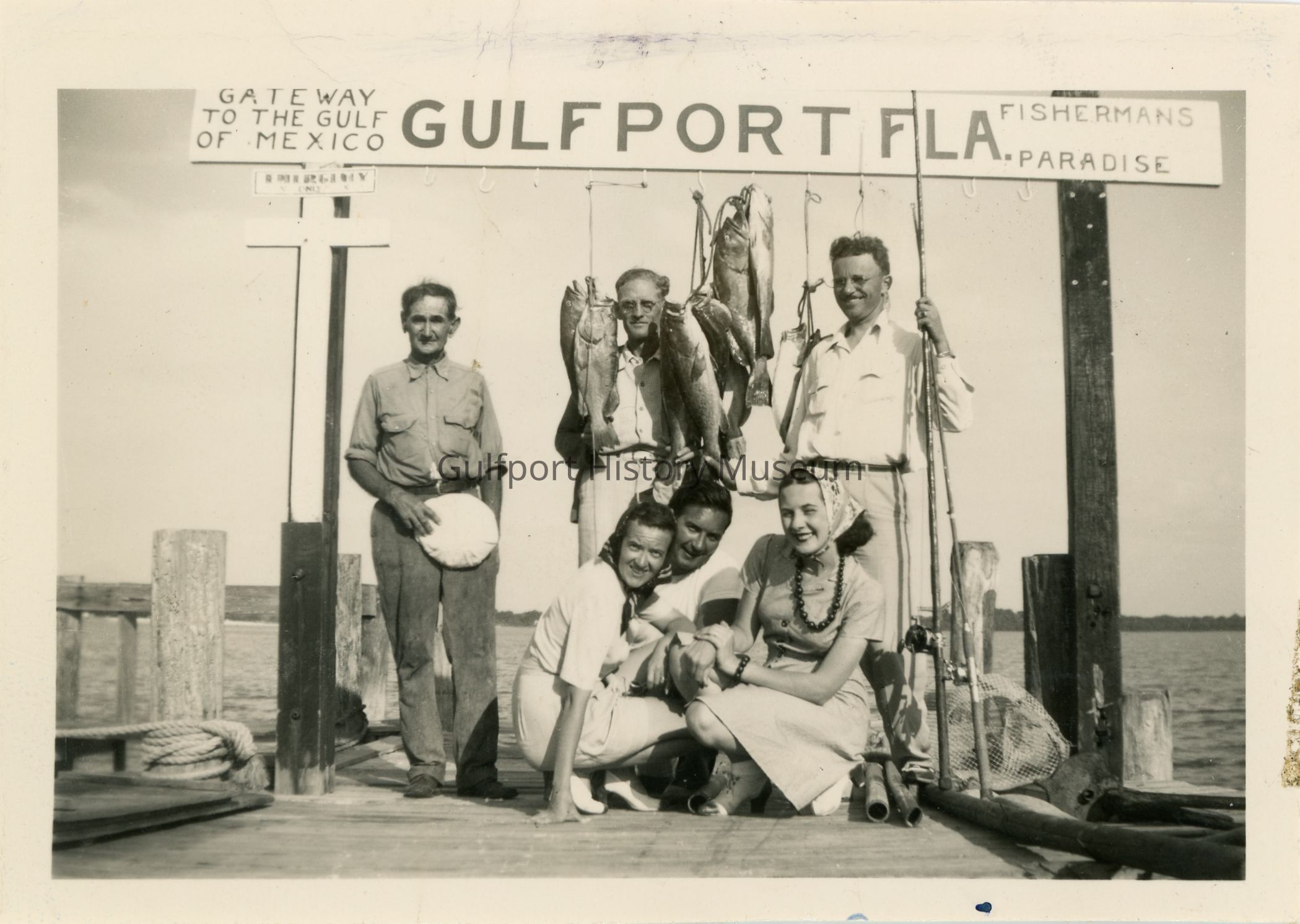 A black and white photograph of a group of six people on the end of a wooden pier under a sign which reads, "GATEWAY TO THE GULF OF MEXICO GULFPORT FLA. FISHERMANS PARADISE." A white cross is nailed to the left signpost with a sign that says "EMERGENCY ONLY." Fish hang from hooks under the sign. One of the men hold several fishing poles.
