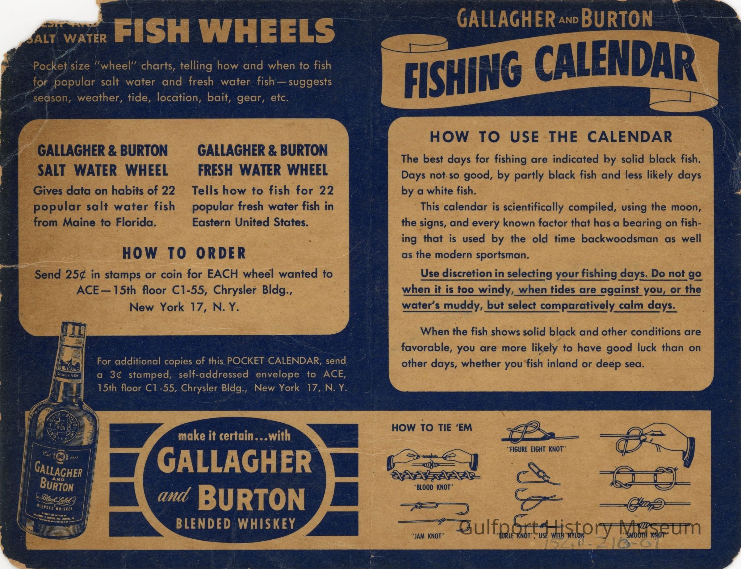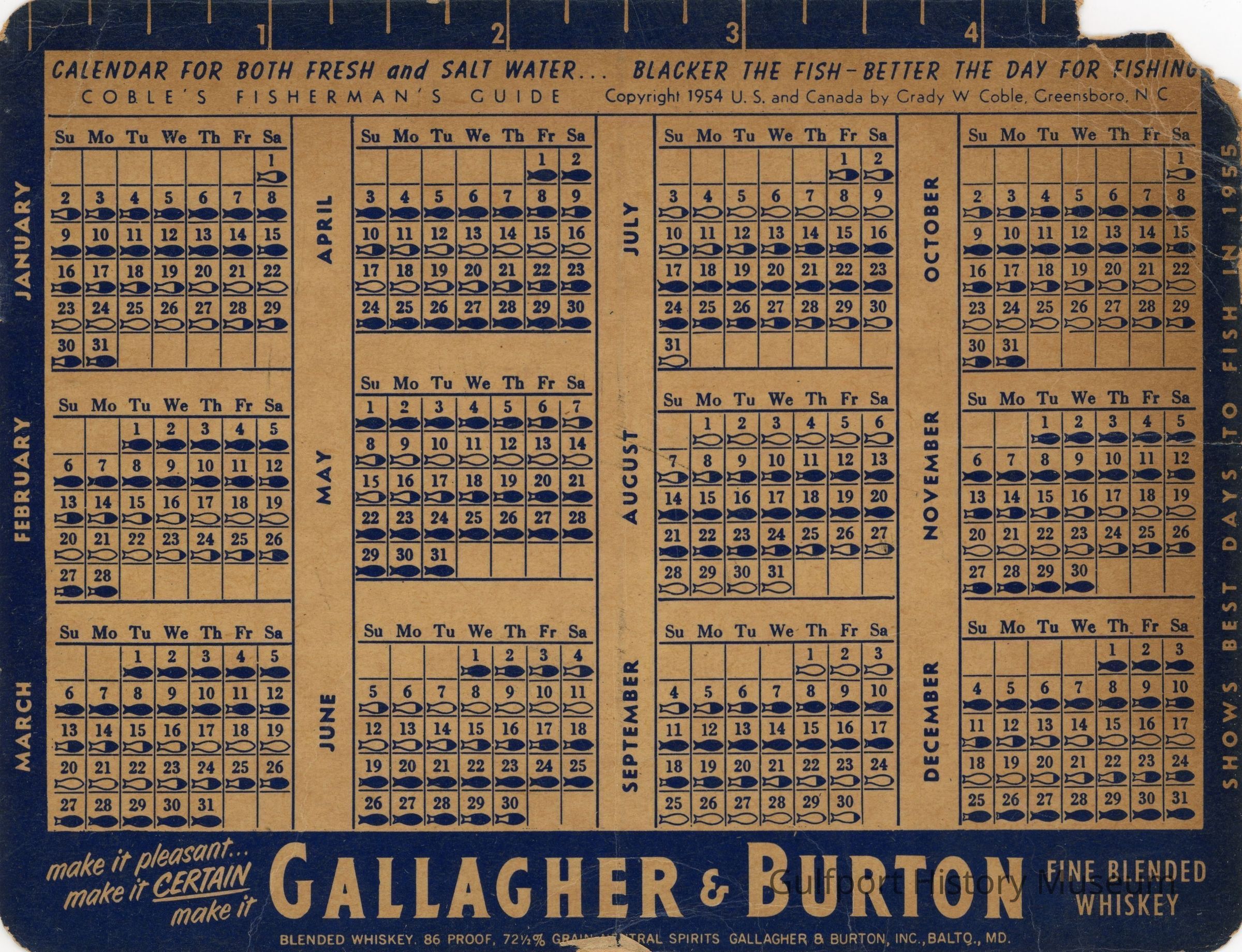 A pocket Gallagher & Burton Whiskey promotional fishing calendar.