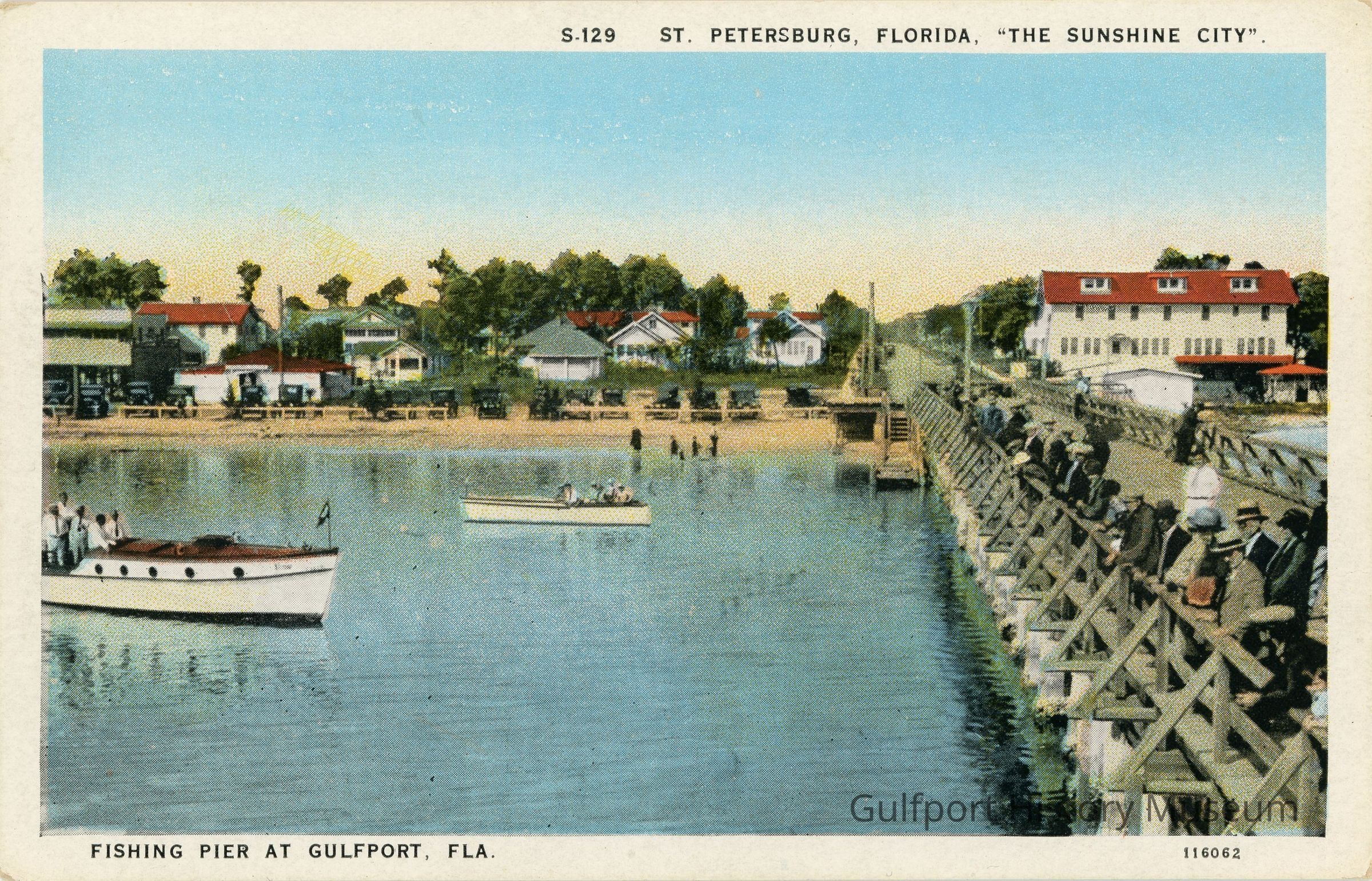 A scan of a postcard showing the old Gulfport wooden pier on Boca Ciega Bay. People are fishing off of the pier and several small boats are in the water. On the shore, the Hotel Dobler/Boca Ciega Inn is visible on the right.