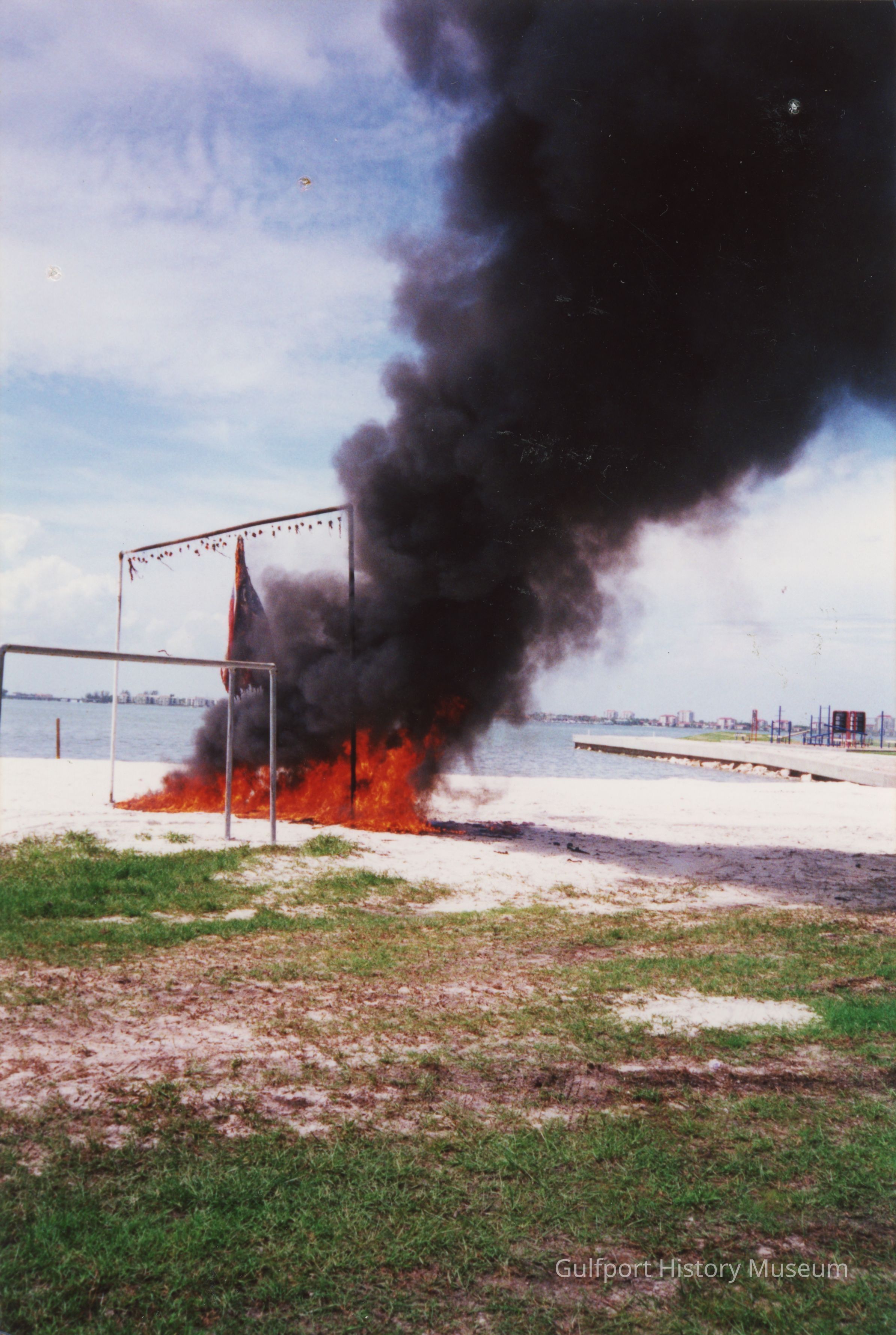 A color photograph of a fire on Gulfport Beach in what appears to be a Flag Day flag burning ceremony. Black smoke is billowing from the flames. Boca Ciega Bay can be seen in the background.
