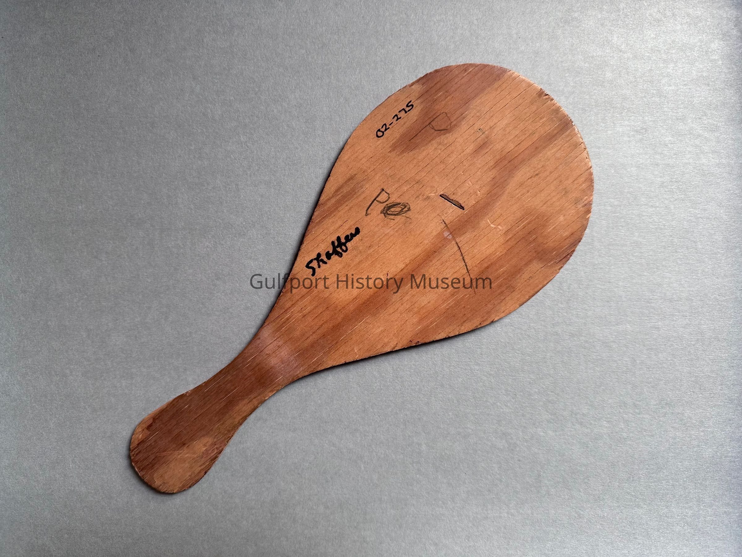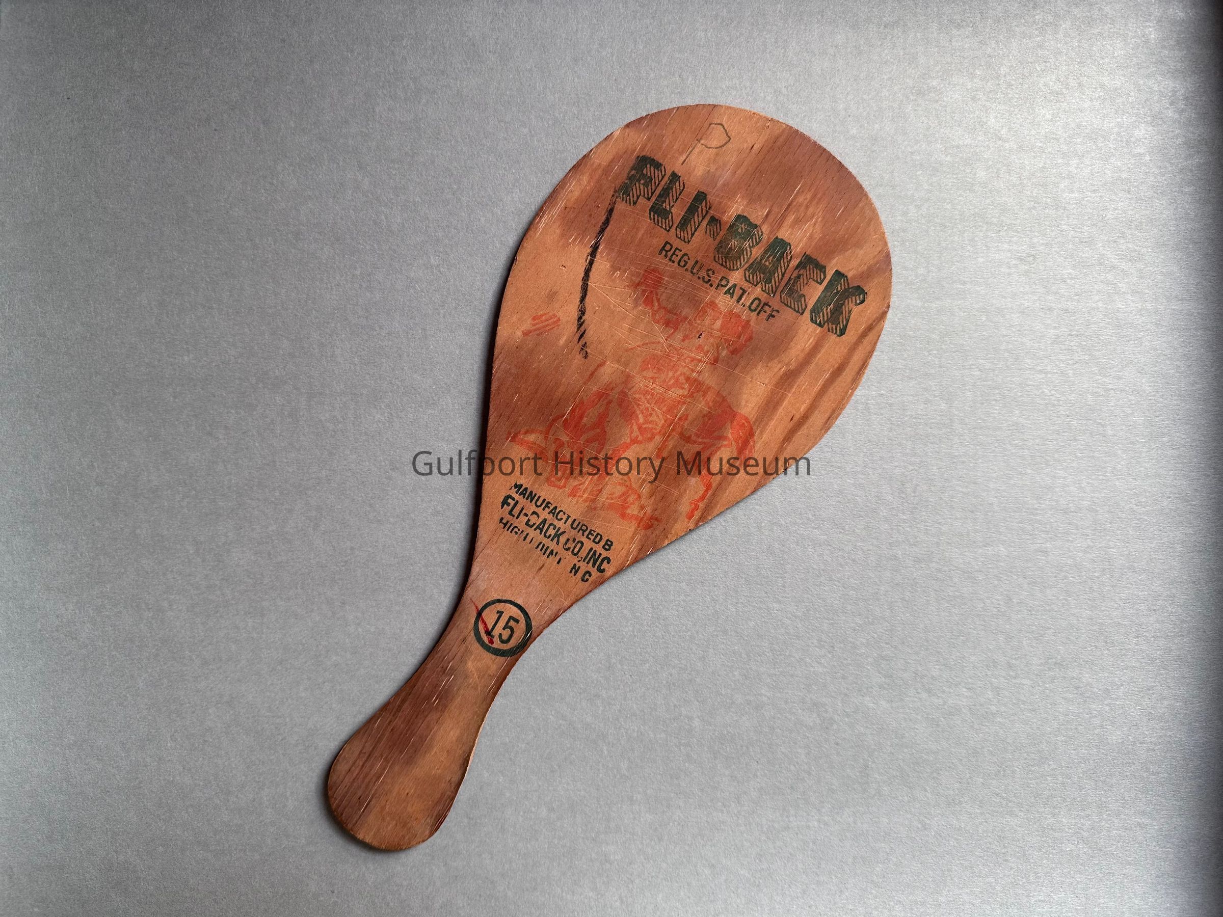A wooden paddle, with an image of a cowboy on a horse on one side. Above this image is large text reading "FLI-BACK".