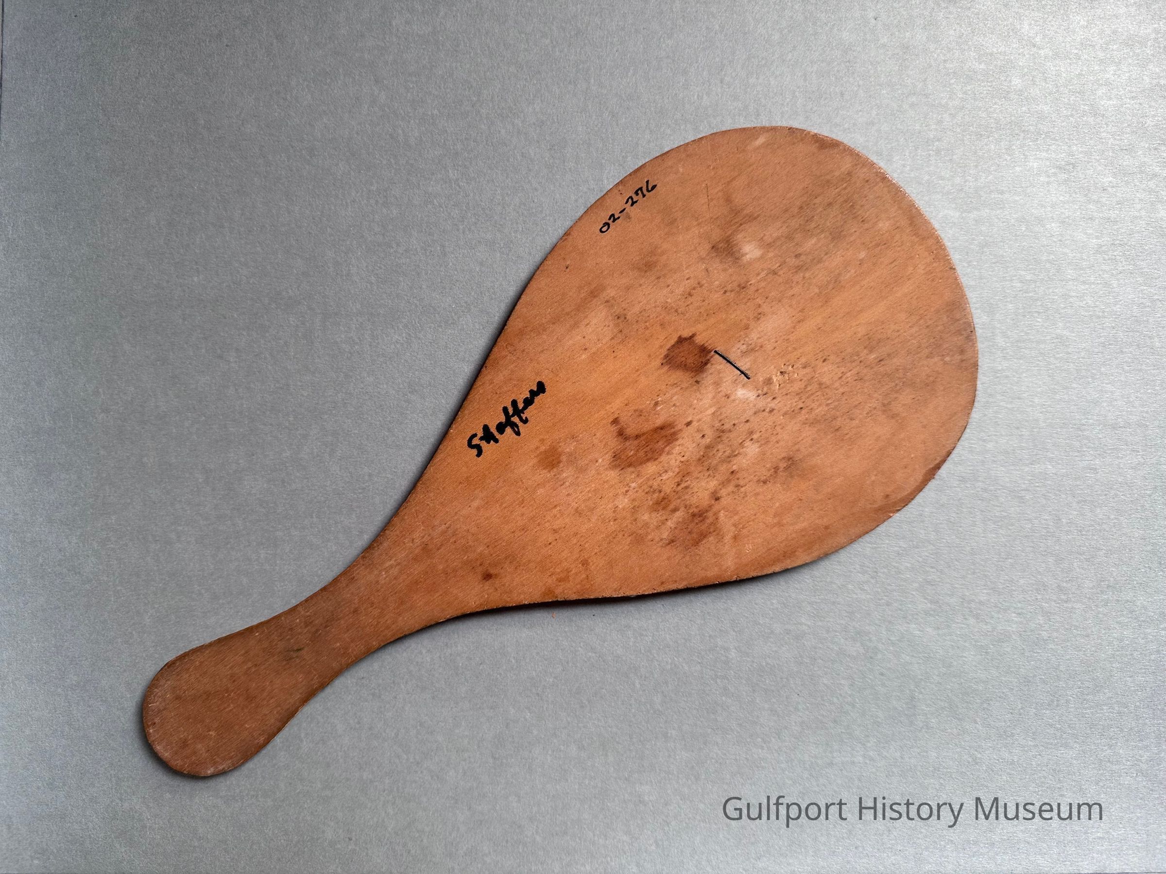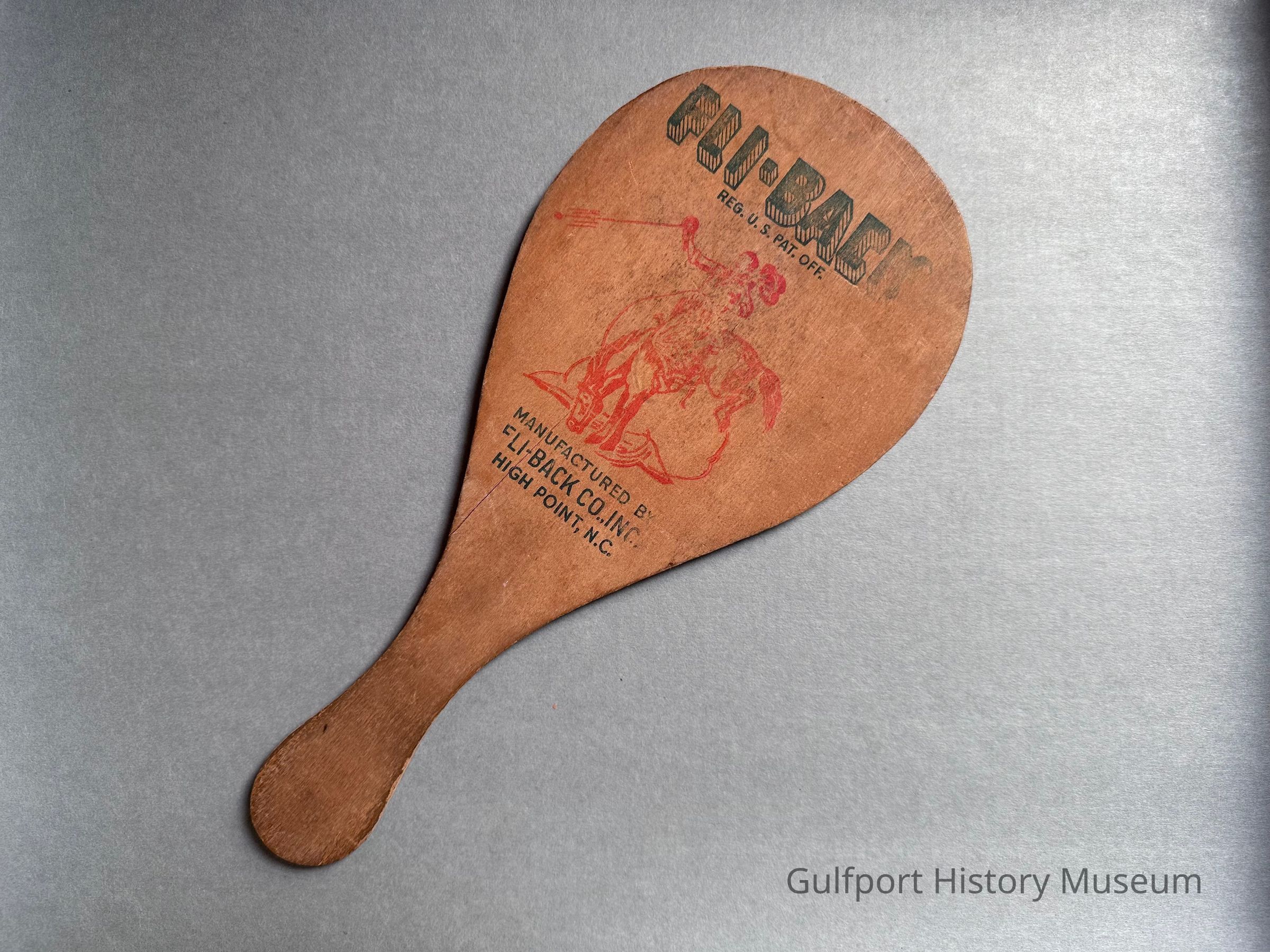 A wooden paddle, with an image of a cowboy on a horse on one side. Above this image is large text reading "FLI-BACK".