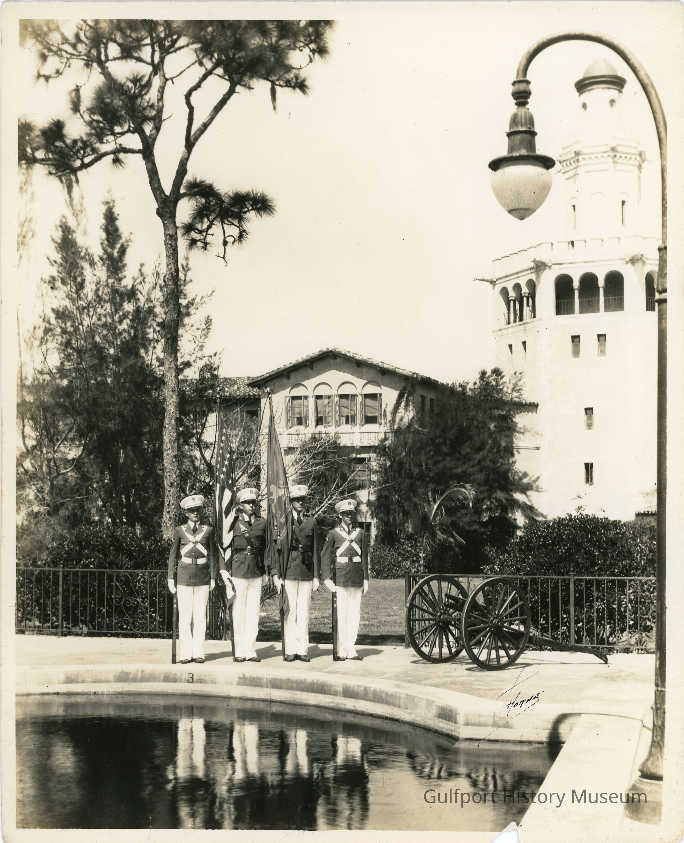 A black and white photograph of the Florida Military Academy. Four men stand in front of the Academy at attention. The two men in the middle are holding flags, and the men on either end are holding rifles. Behind them is a small cannon, and in front of them is a body of water in which they are reflected.Photograph Details