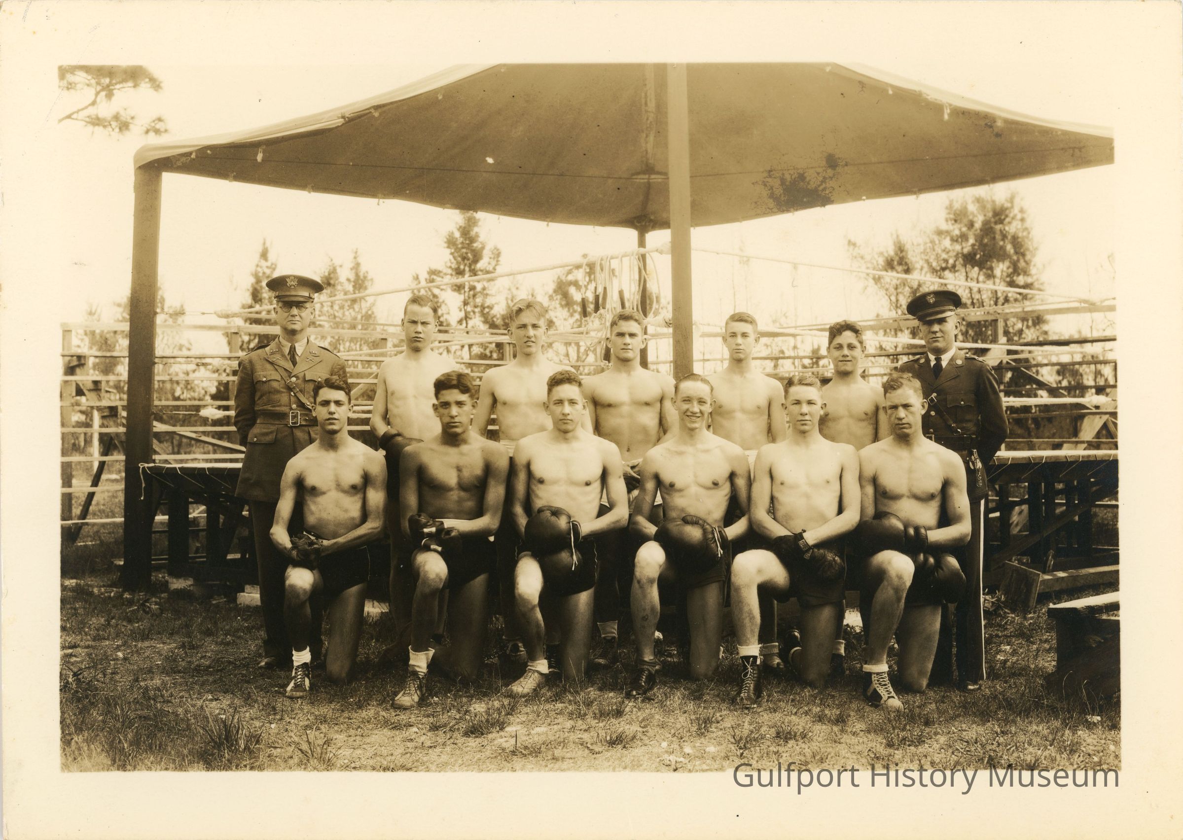 A black and white photograph of several men from the Florida Military Academy. They are possibly members of the academy's boxing team, as the men at the center of the photograph are wearing boxing gloves, and they are all standing in front of a boxing ring. There are 11 members of the club, and two older men stand on opposite ends of the group in military uniforms.Photograph Details
