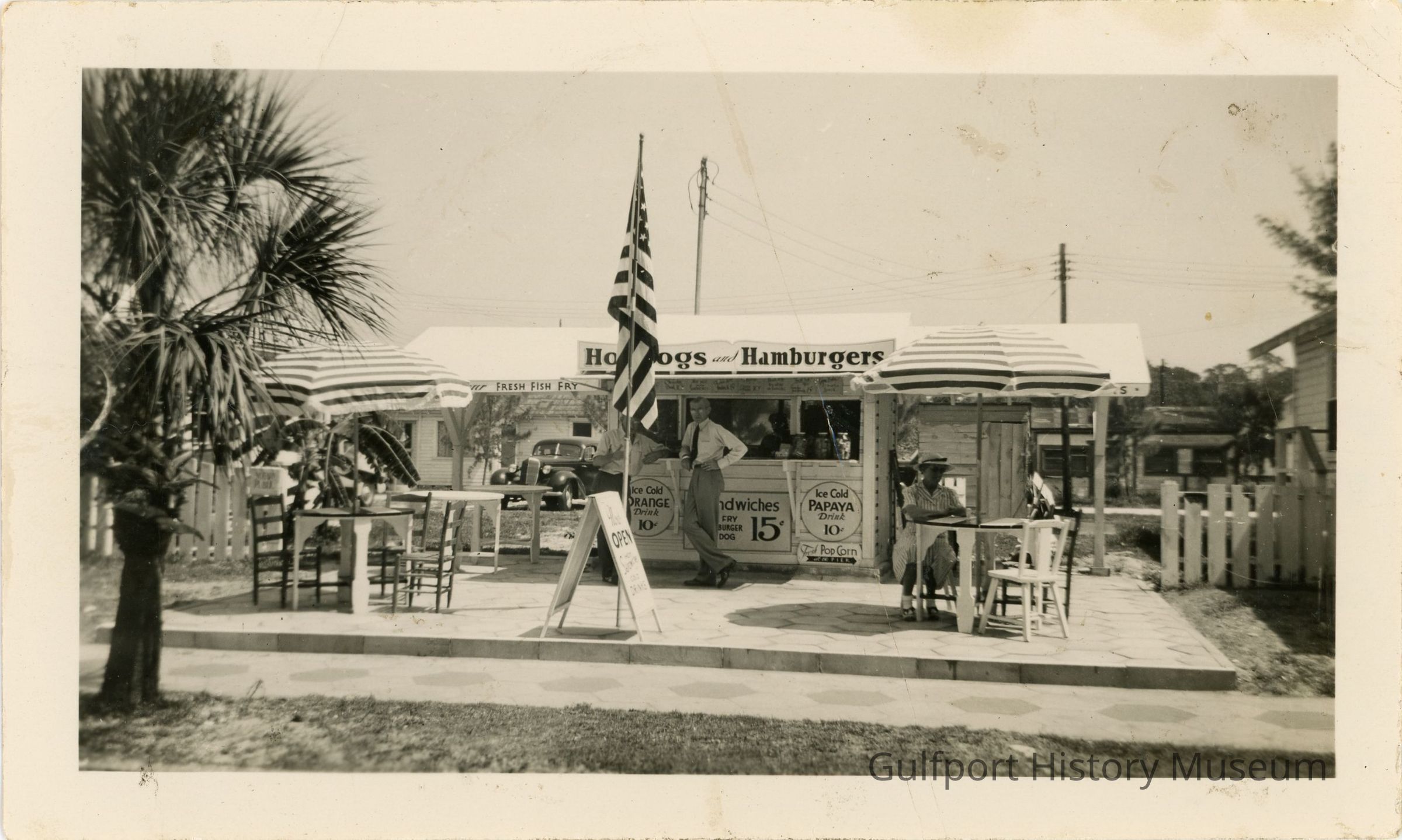A black and white photograph of a food stand (Bayview Terrace Restaurant?). The sign above reads, "Hotdogs and Hamburgers." There are other signs on the building which read, "Ice Cold ORANGE Drink 10c", "Sandwiches [Fish] Fry Burger [Hot] Dog 15c", "Ice Cold PAPAYA Drink 10c" and "Fresh Pop Corn at the Pier". The extended awning on the side of the stand reads, "FRESH FISH FRY."