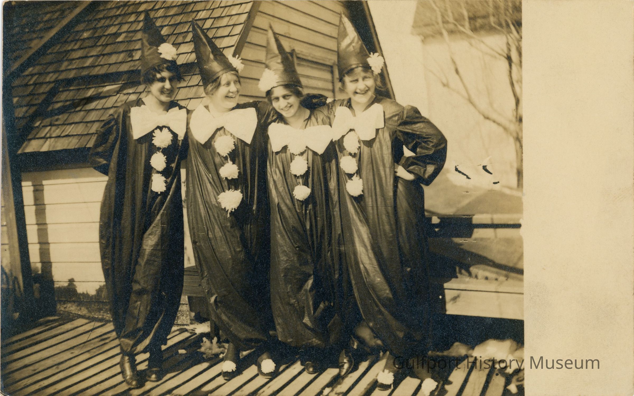 A black and white photograph postcard of four women dressed as clowns with pointed hats, pom-poms, and large bows standing on a wooden deck in front of buildings with horizontal wood paneling and slated roofs.