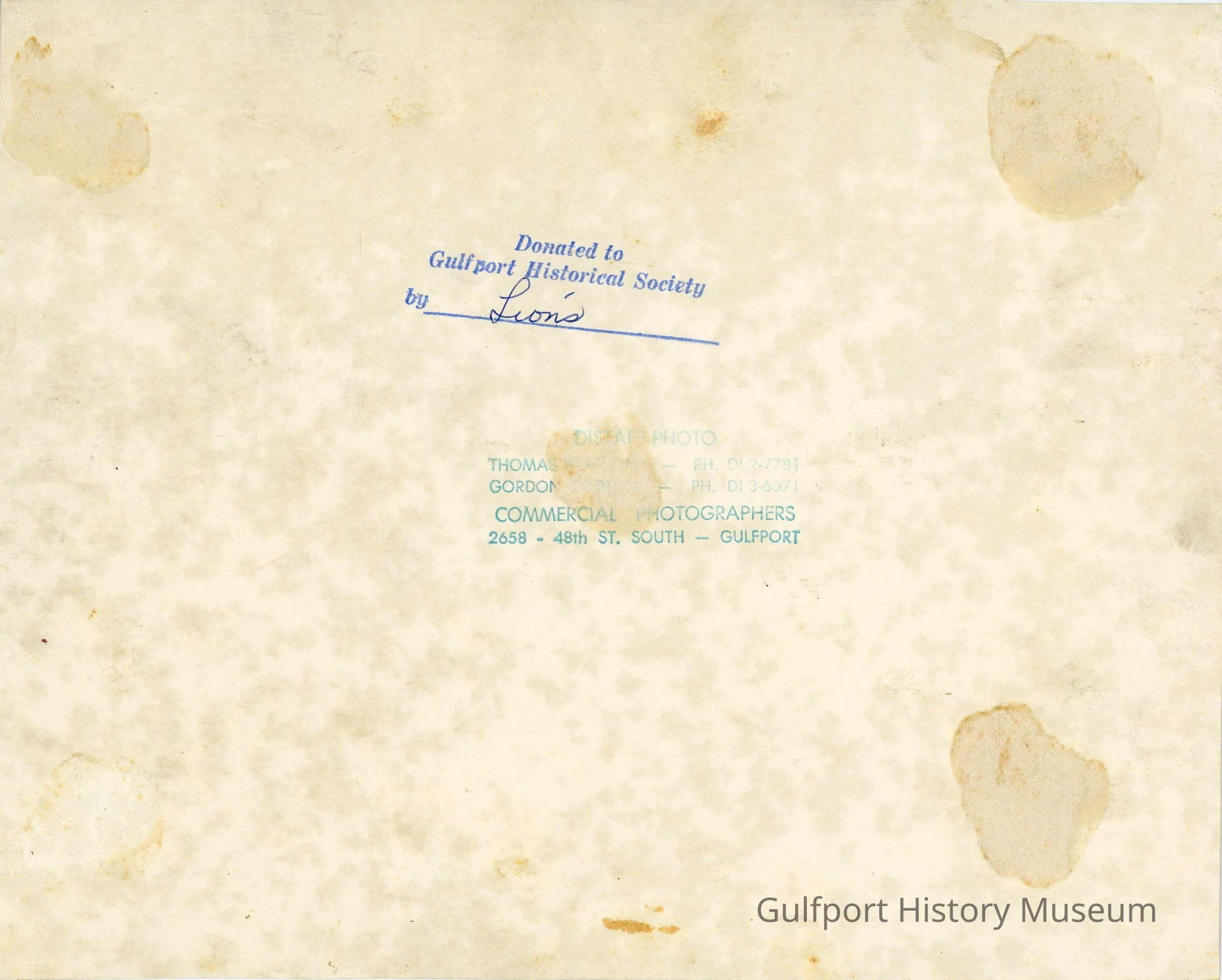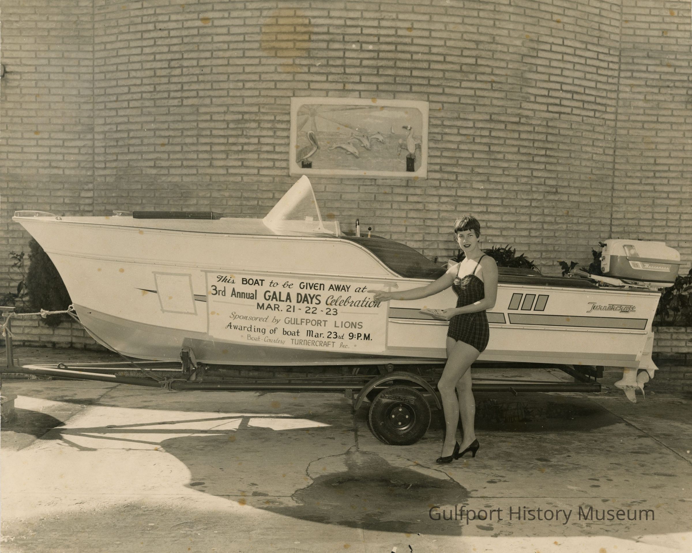 A black and white photograph of Gala Days Princess Rhoda Clayton posing in front of a white boat near the Gulfport Casino. She has short, cropped hair and wears a dark swimsuit and heels. The boat has a sign attached to it which reads: