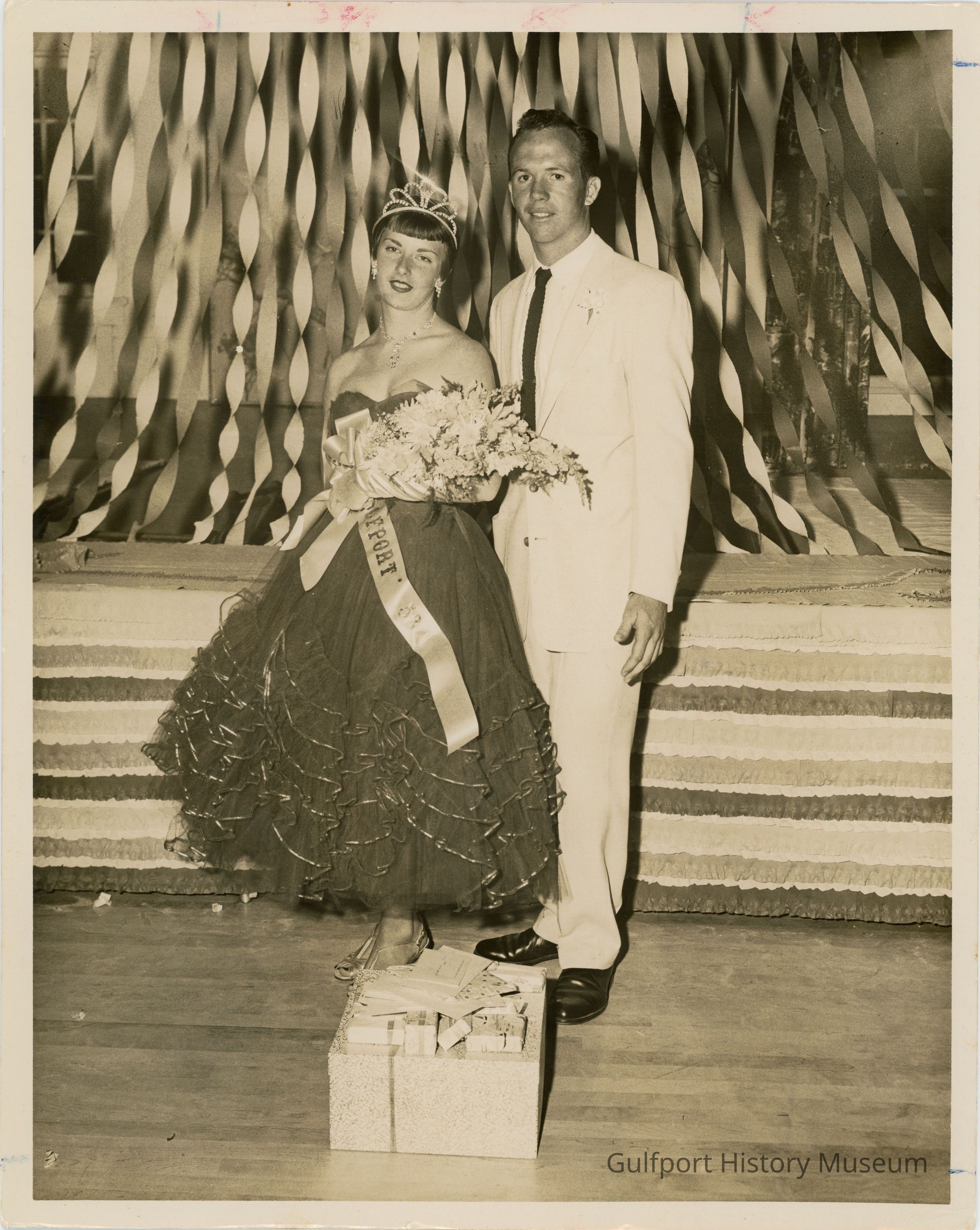 A black and white photograph of Rhoda Clayton, newly crowned Miss Gulfport, and Carl Osgood posing for a photo in front of a streamer-decorated stage. Both are in formal attire; she wears a tiara, dark dress, and holds a bouquet of flowers and he wears a white suit with a dark tie. There is a pile of packages on the floor in front of them, consisting of boxes and cards.Photograph Details