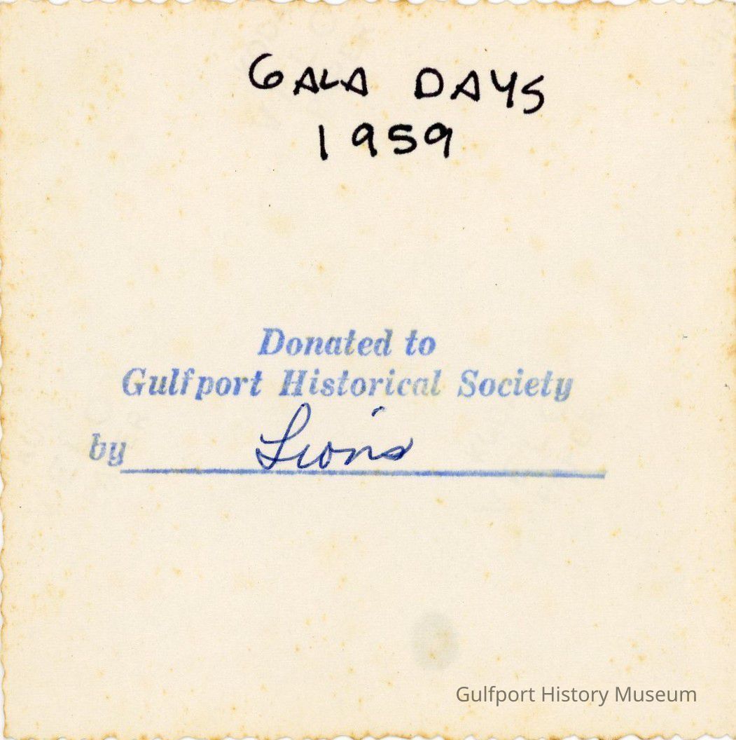 A black and white photograph of the Gala Days Parade as a flatbed truck decorated with a Gulfport Lions Club sign turns from Beach Blvd onto Shore Blvd in front of Bell's Corner Restaurant. Onlookers are standing along either side of the street watching the procession.