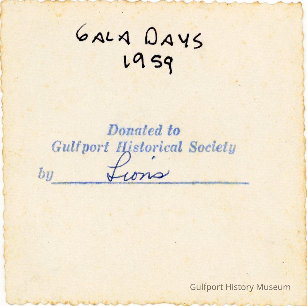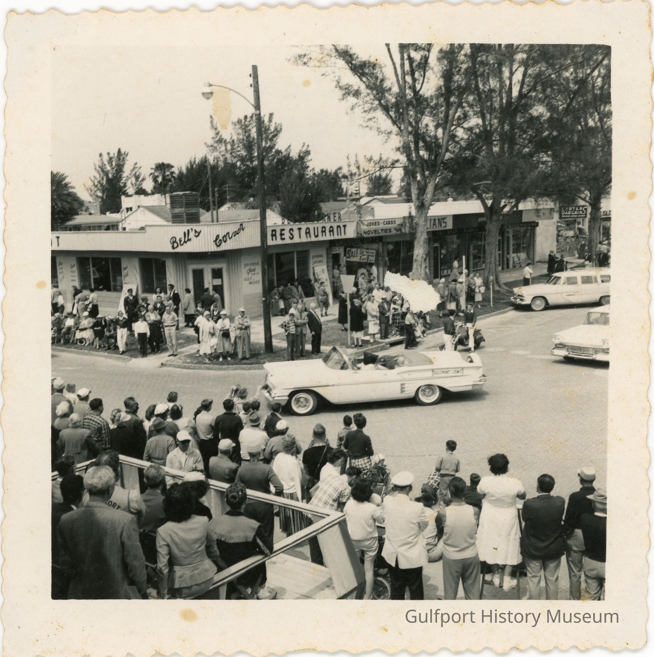 A black and white photograph of the Gala Days Parade as a car decorated for the Gulfport Lions Club turns from Beach Blvd onto Shore Blvd in front of Bell's Corner Restaurant. Another car follows it. Onlookers are standing along either side of the street watching the procession.