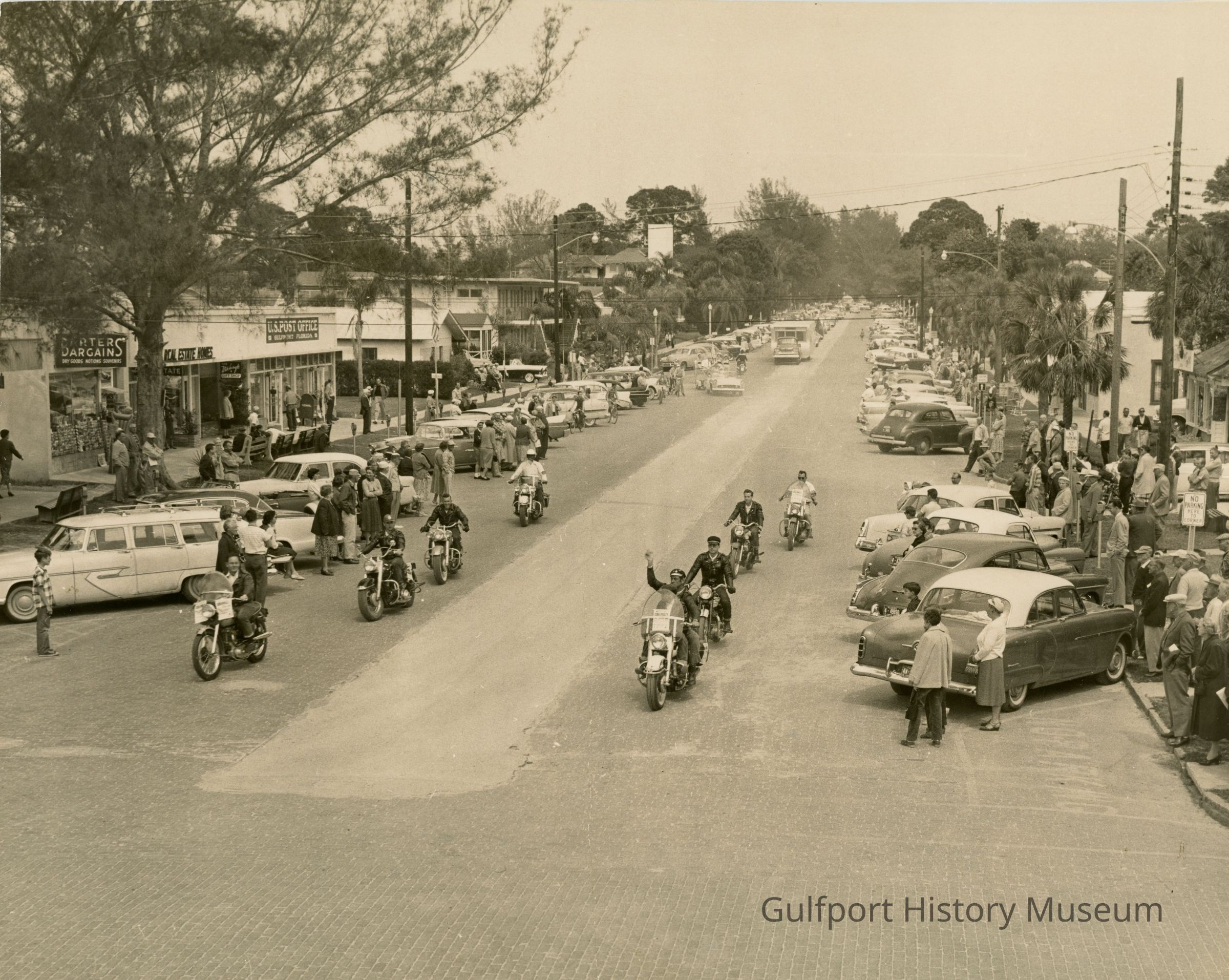 A black and white photograph of a parade going down Beach Blvd. There are cars parked along either side of the street. There are people watching both from the street and the sidewalk. There is a small group of motorcyclists consisting of eight riders. There is a car with a float coming up behind them from the distance, and the rest of the parade behind that. There are signs on the buildings on the west side of the street that read, "BARTERS BARGAINS DRY GOODS, NOTIONS, SOUVENIRS," "REAL ESTATE HOMES," "THE Witchcraft GIFT SHOP," and a sign for the "U.S. POST OFFICE Gulfport Florida."Photograph Details