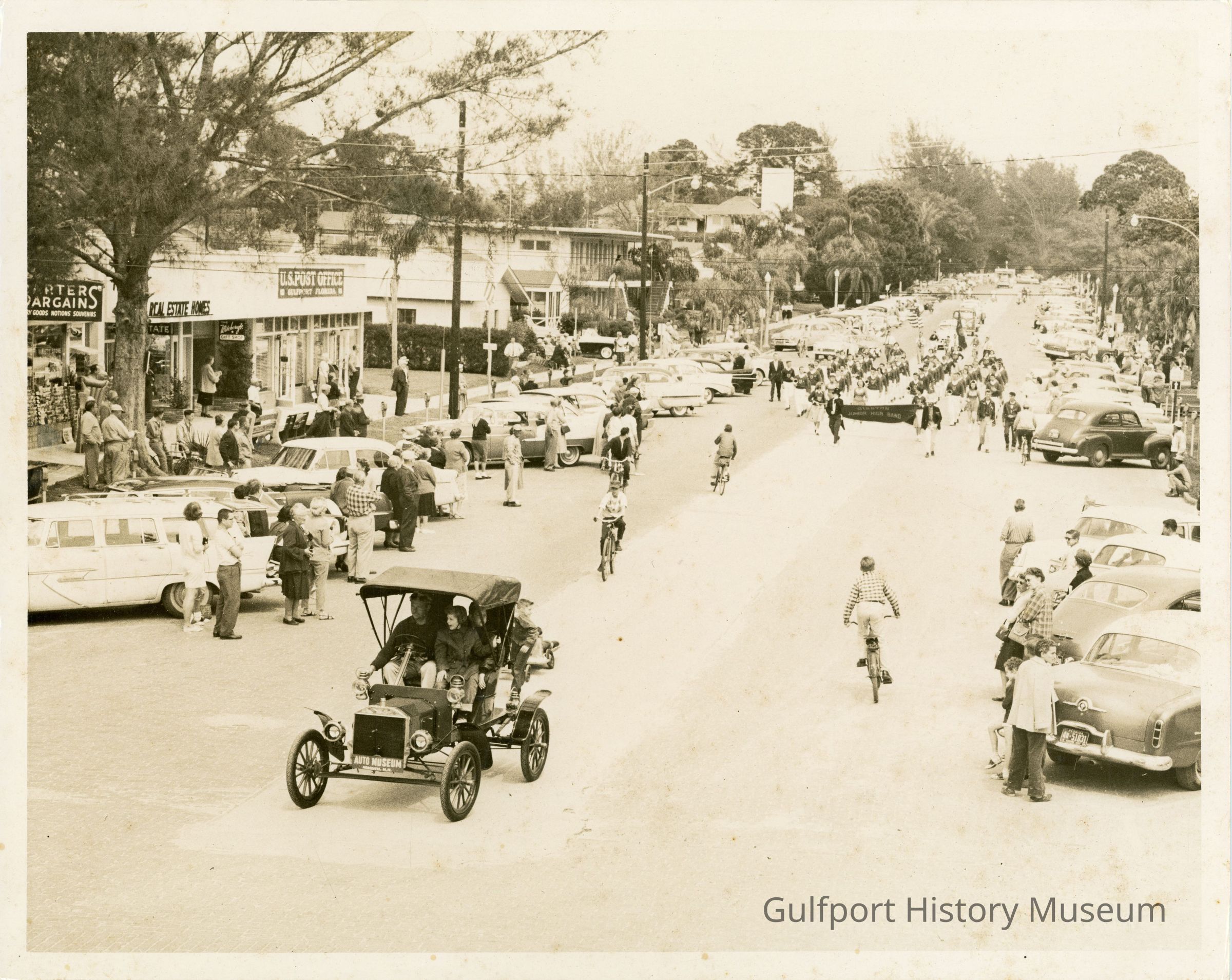 A black and white photograph during the Gala Days Parade marching down Beach Blvd with an active mix of cars and pedestrians. A vintage car and a few bicycle riders continue down the road in front of a marching band. Onlookers stand by their parked cars on the side of the road waiting for the parade. There are signs on the buildings on the west side of the street that read, "BARTERS BARGAINS DRY GOODS, NOTIONS, SOUVENIRS," "REAL ESTATE HOMES," "THE Witchcraft GIFT SHOP," and a sign for the "U.S. POST OFFICE Gulfport Florida."Photograph Details