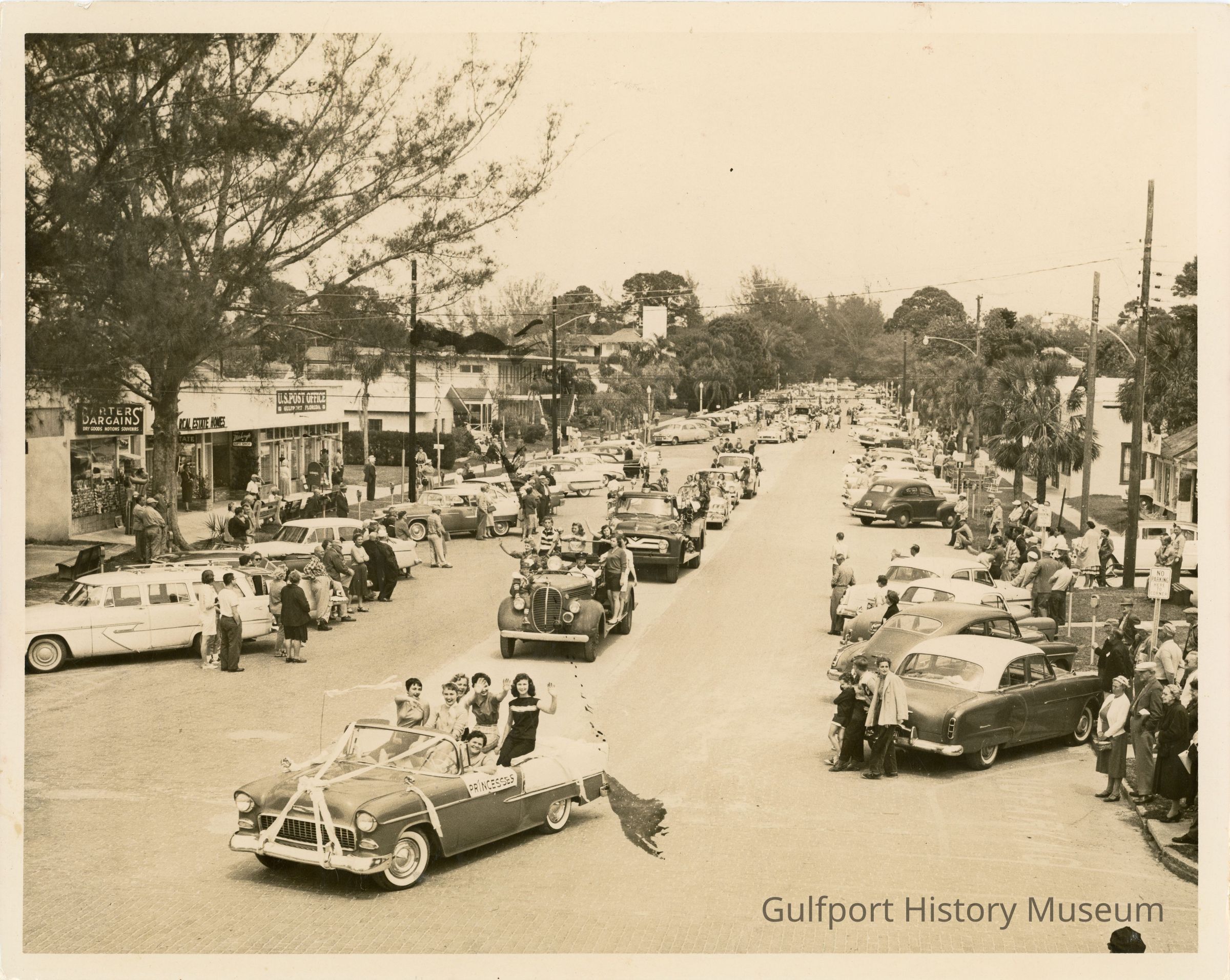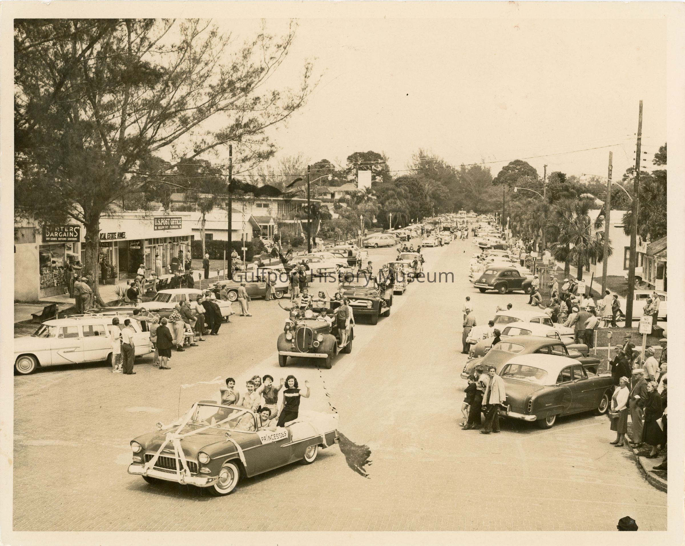 A black and white photograph of Beach Blvd during the Gala Days Parade. The front car holds the Gulfport Princesses; it is wrapped ribbon and the five princesses sit high on the seats of the convertible. The road is lined with parked cars and spectators in front of shops. There are signs on the buildings on the west side of the street that read, "BARTERS BARGAINS DRY GOODS, NOTIONS, SOUVENIRS," "REAL ESTATE HOMES," "THE Witchcraft GIFT SHOP," and a sign for the "U.S. POST OFFICE Gulfport Florida."Photograph Details