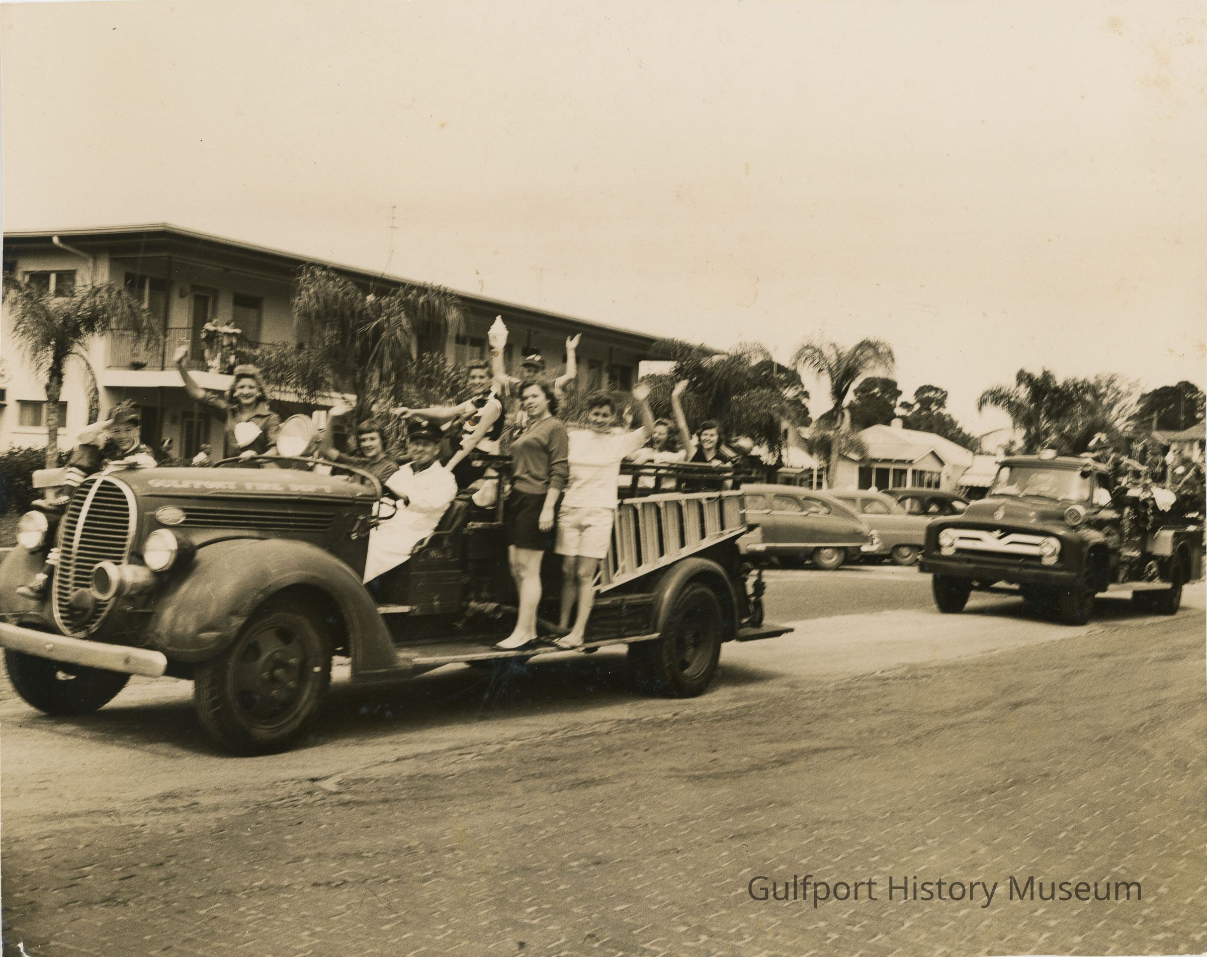 Parades & processions--Florida--Gulfport--1950-1960, Fire departments--Florida--Gulfport--1950-1960, Fire apparatus, Firefighting equipment, Vehicles, Automobiles--1950-1960, Fashion--1950-1960