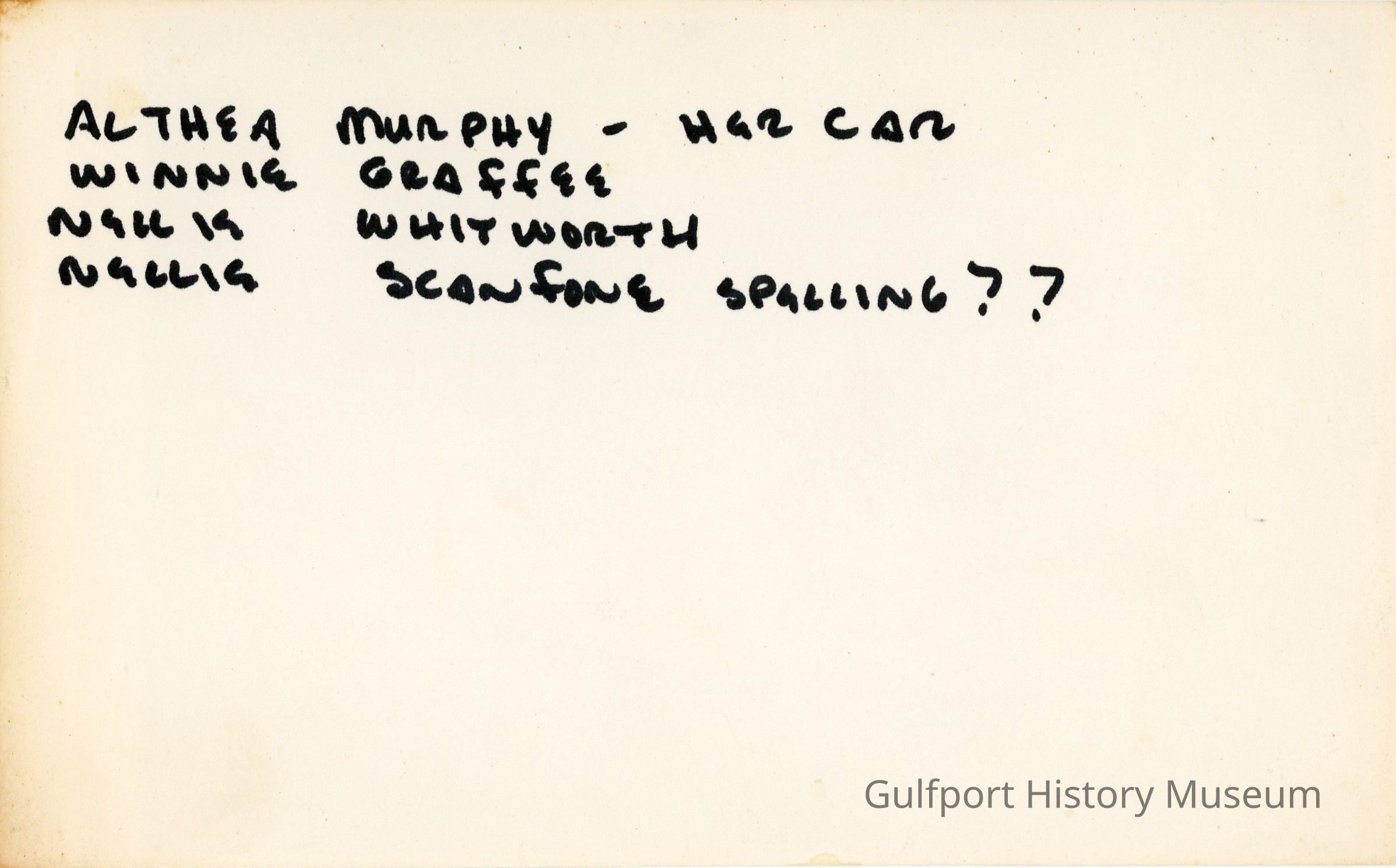 ALTHEA MURPHY - HER CAR WINNIE GRAFFEE NELLIE WHITWORTH NELLIE SCANFONE SPELLING ??
