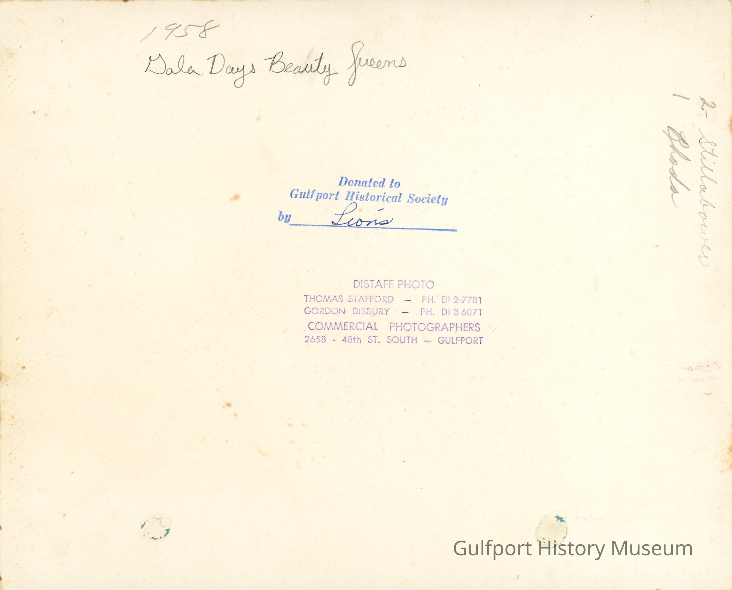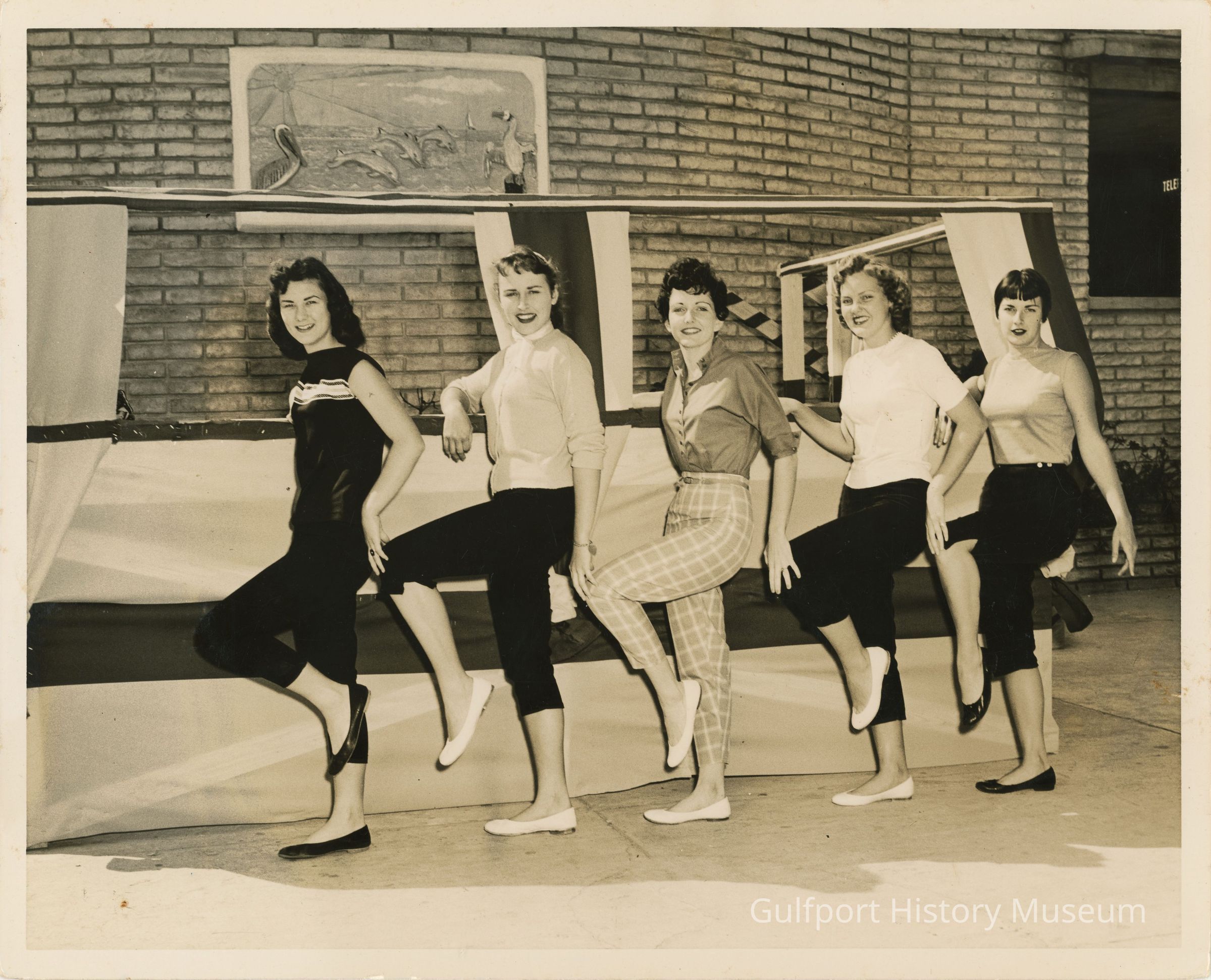 A black and white photograph of five Gulfport Princesses posing for a photo on next to a temporary, decorated event structure outside of Gulfport Casino. Each of them are posing in a line with their left leg raised.