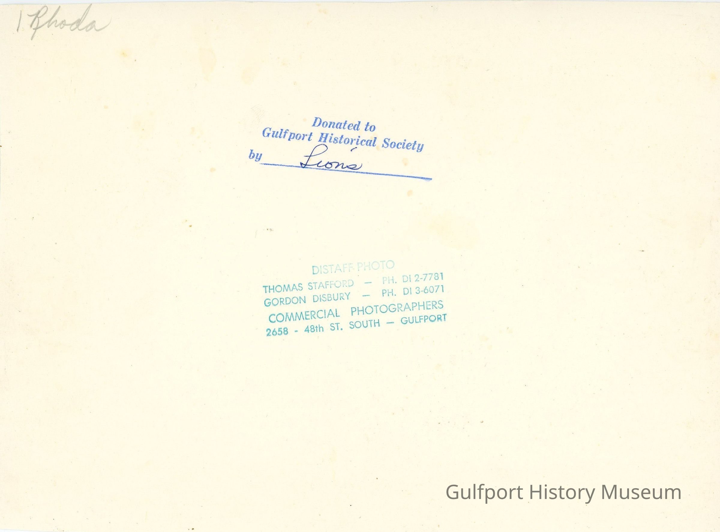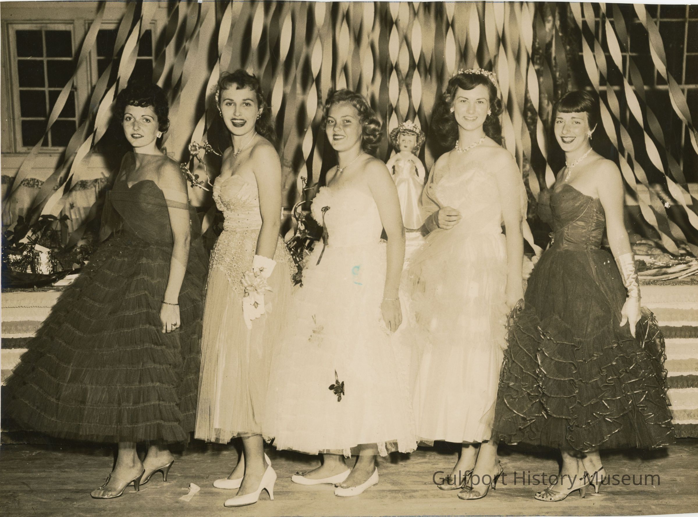 A black and white photograph of five Gulfport Princesses dressed in formal gowns posing in a row. They are standing in front of a small stage decorated with streamers of various colors and shades hanging from the ceiling. There is a medium sized doll wearing a tiara behind them.