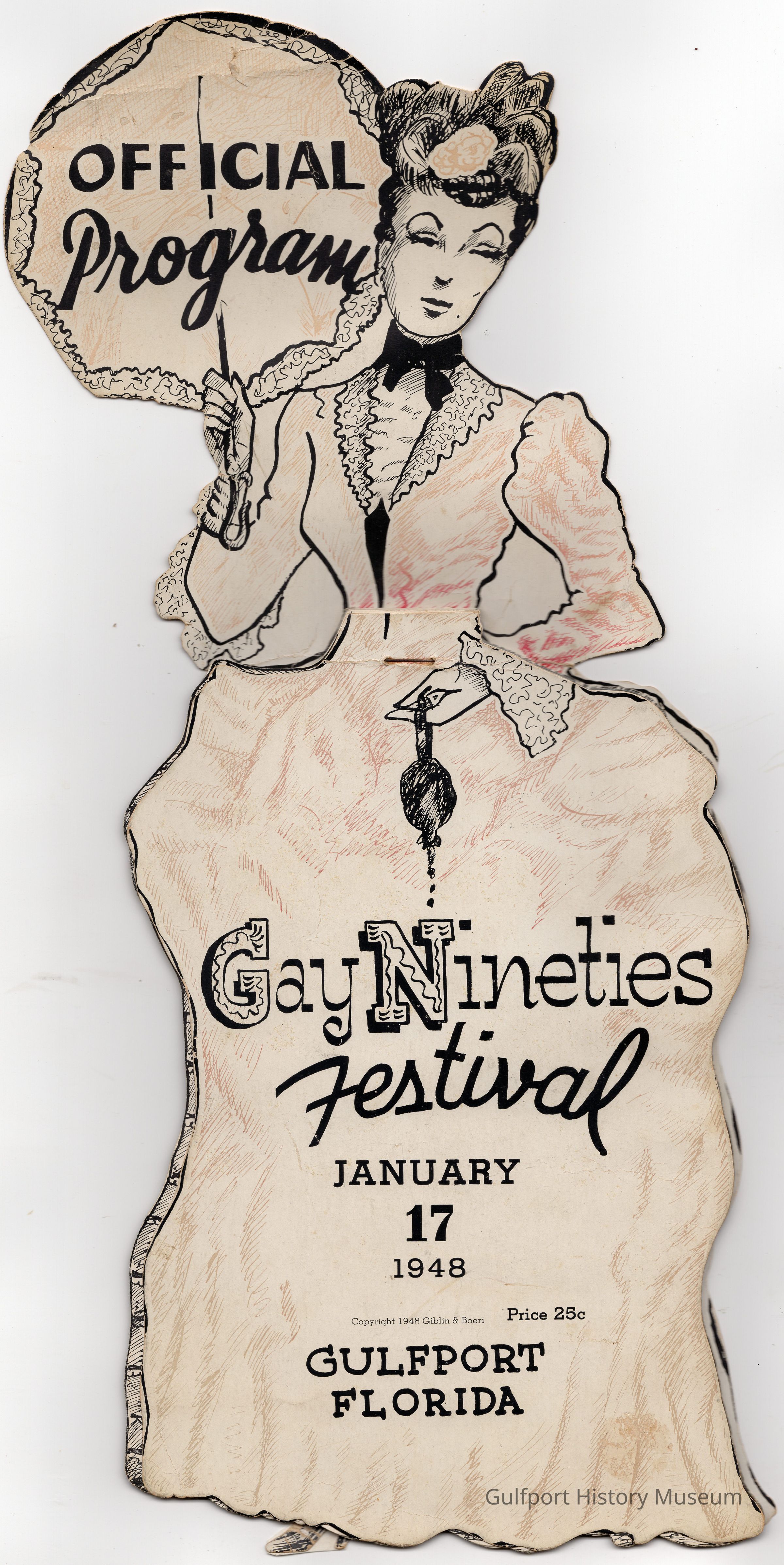 An official program for the Gay Nineties Festival. The program is in the form of a Victorian woman with a parasol. The skirt of her dress is a flip booklet.