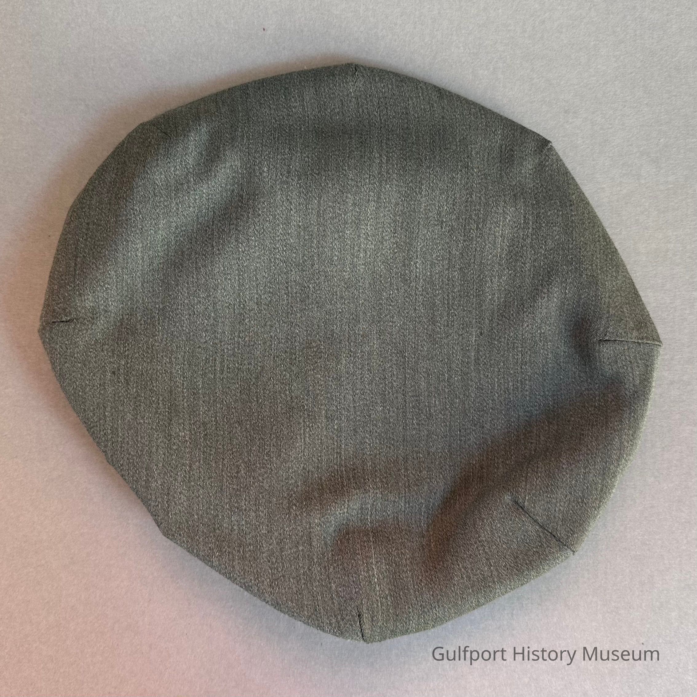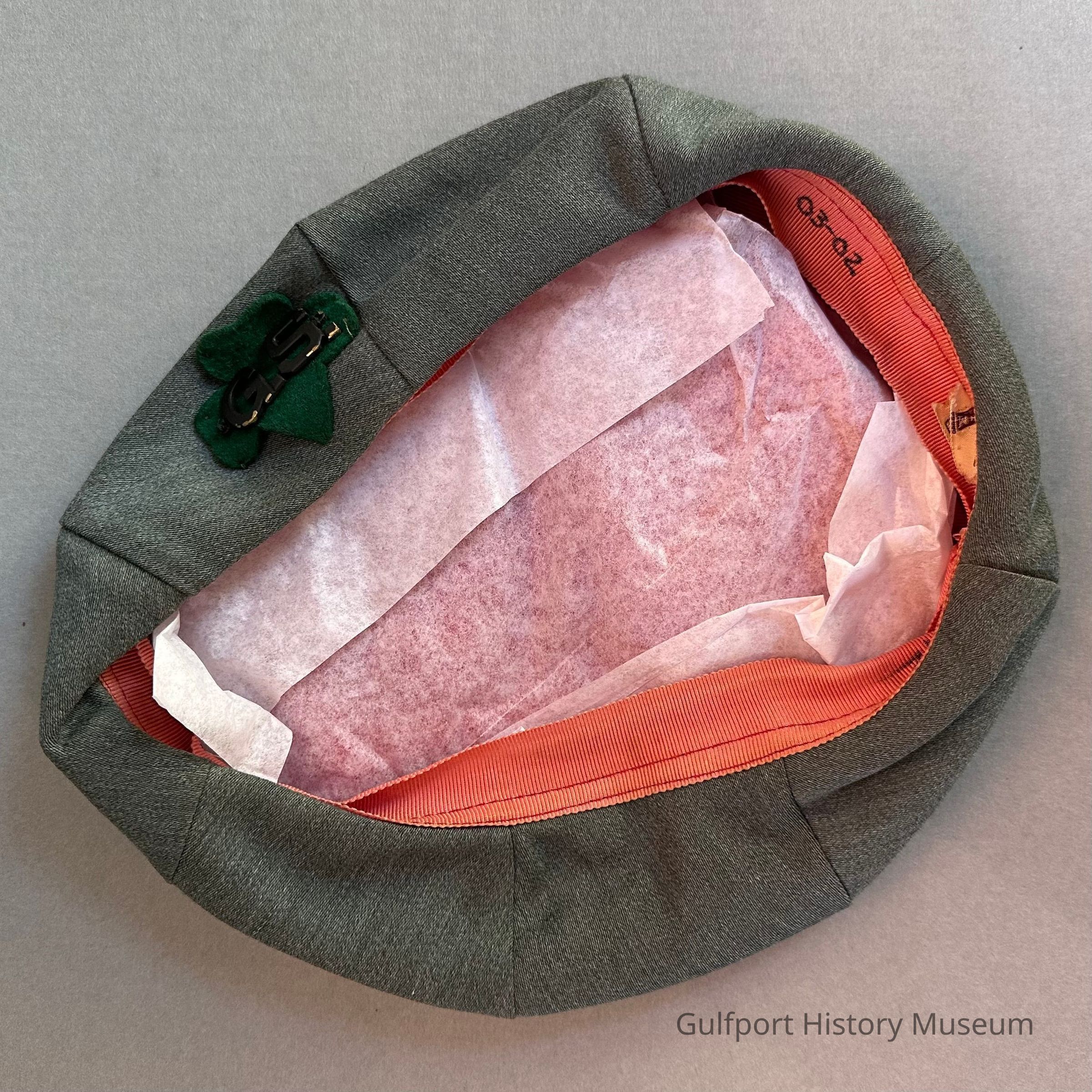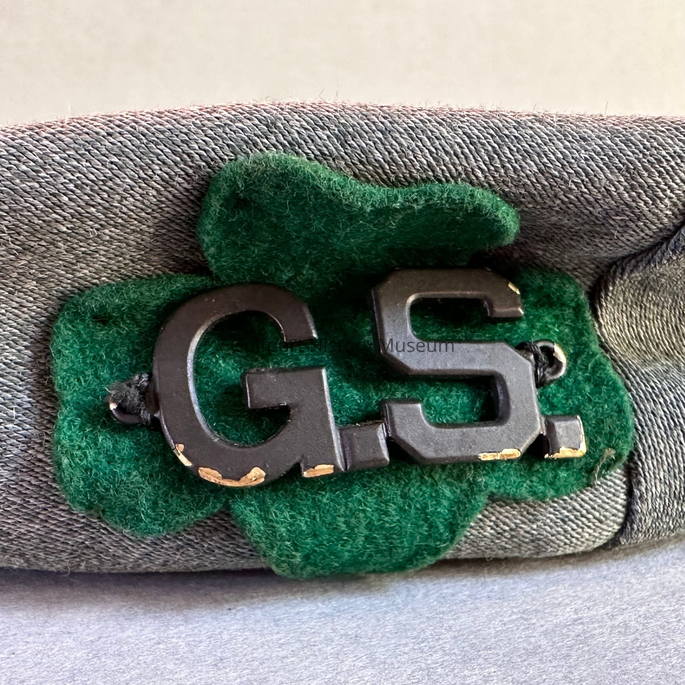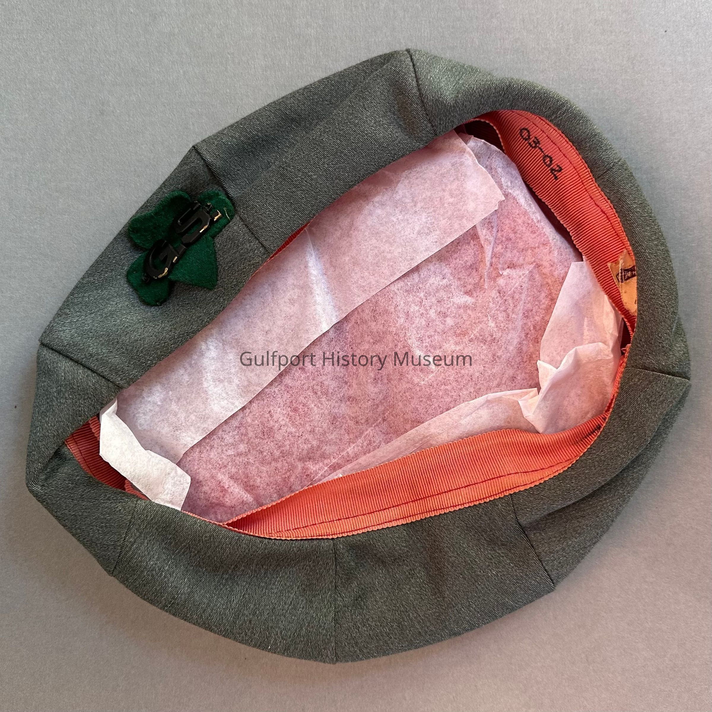 A gray green beret with red lining a stitched on felt trefoil with metal "G.S." pin.