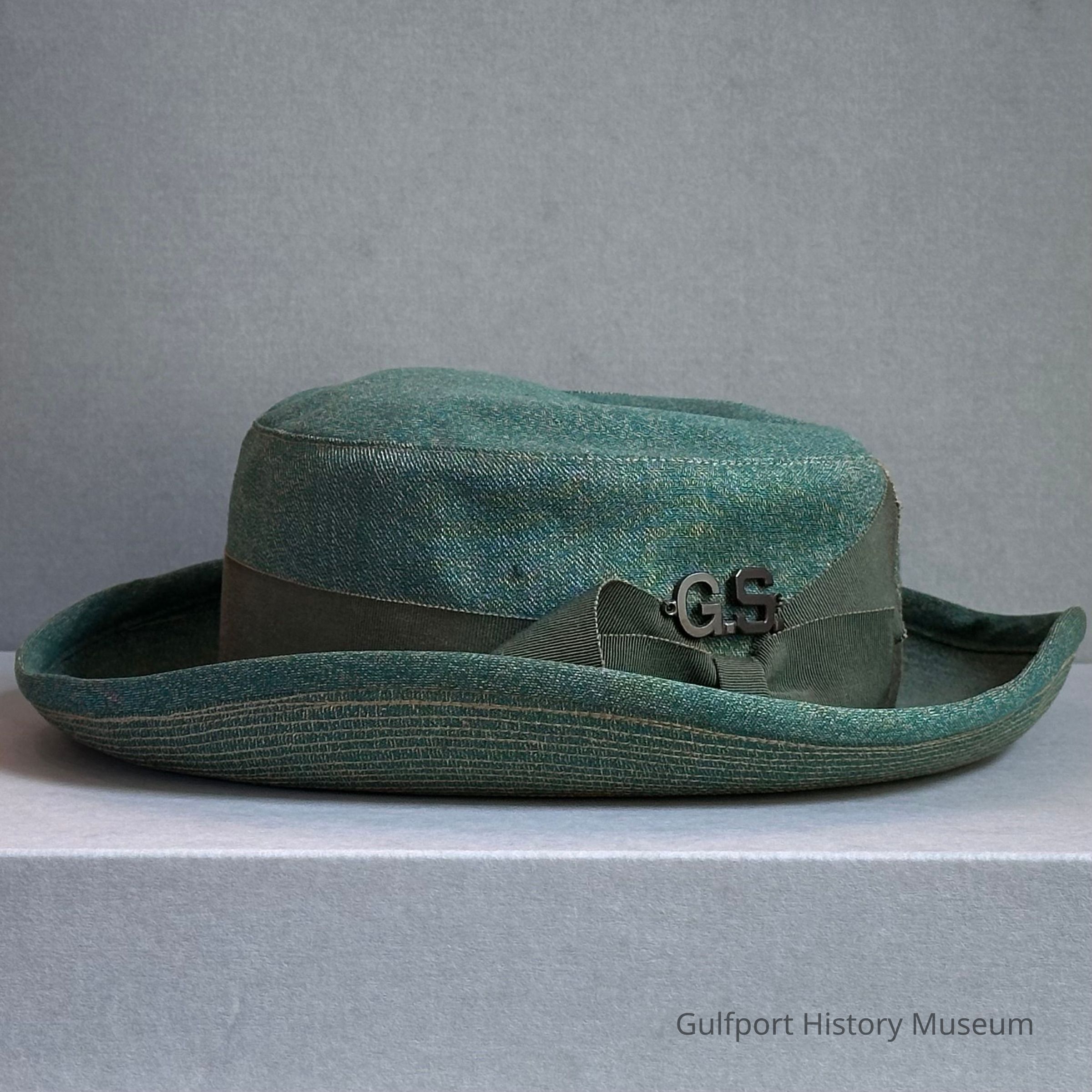 A green, wide brim adult Girl Scout hat with a darker green ribbon and a pin that reads G.S.