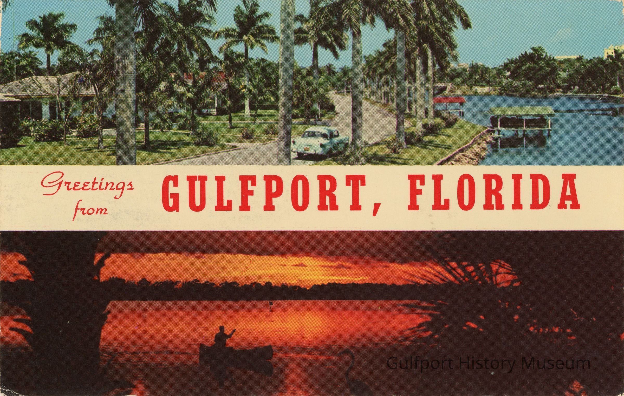 A split color photochrome postcard. The top half shows a waterfront palm tree-lined residential street and the bottom half shows a man in a rowboat on the water at sunset. Images are not of Gulfport; this postcard design was printed for many Florida cities.