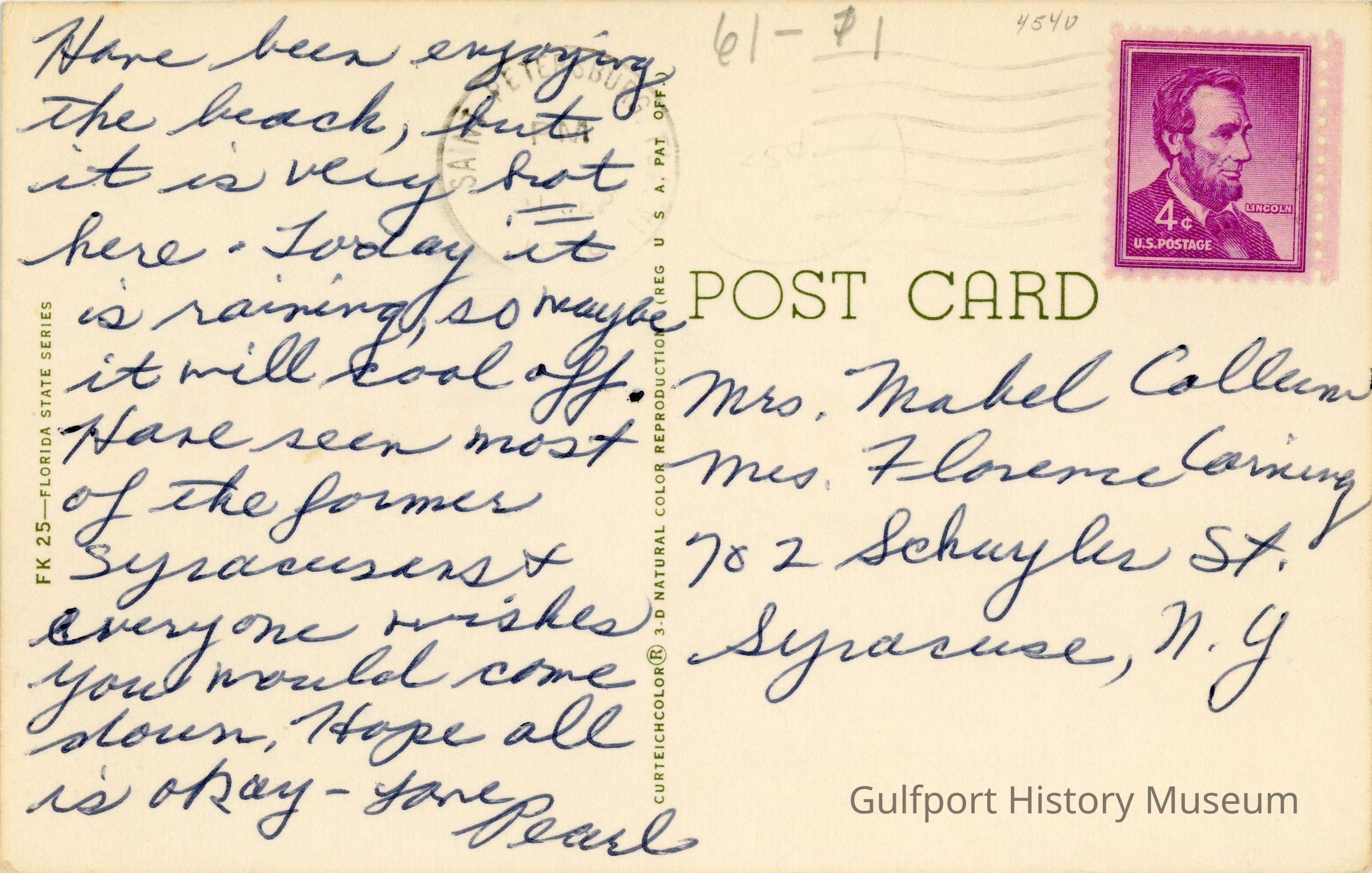 61 - 1c / 4540 / Have been enjoying / the beach, but / it is very hot / here. Today it / is raining, so maybe / it will cool off. / Have seen most / of the former / Syracusers + / everyone wishes / you would come / down. Hope all / is okay - Love / PearlTranscriber