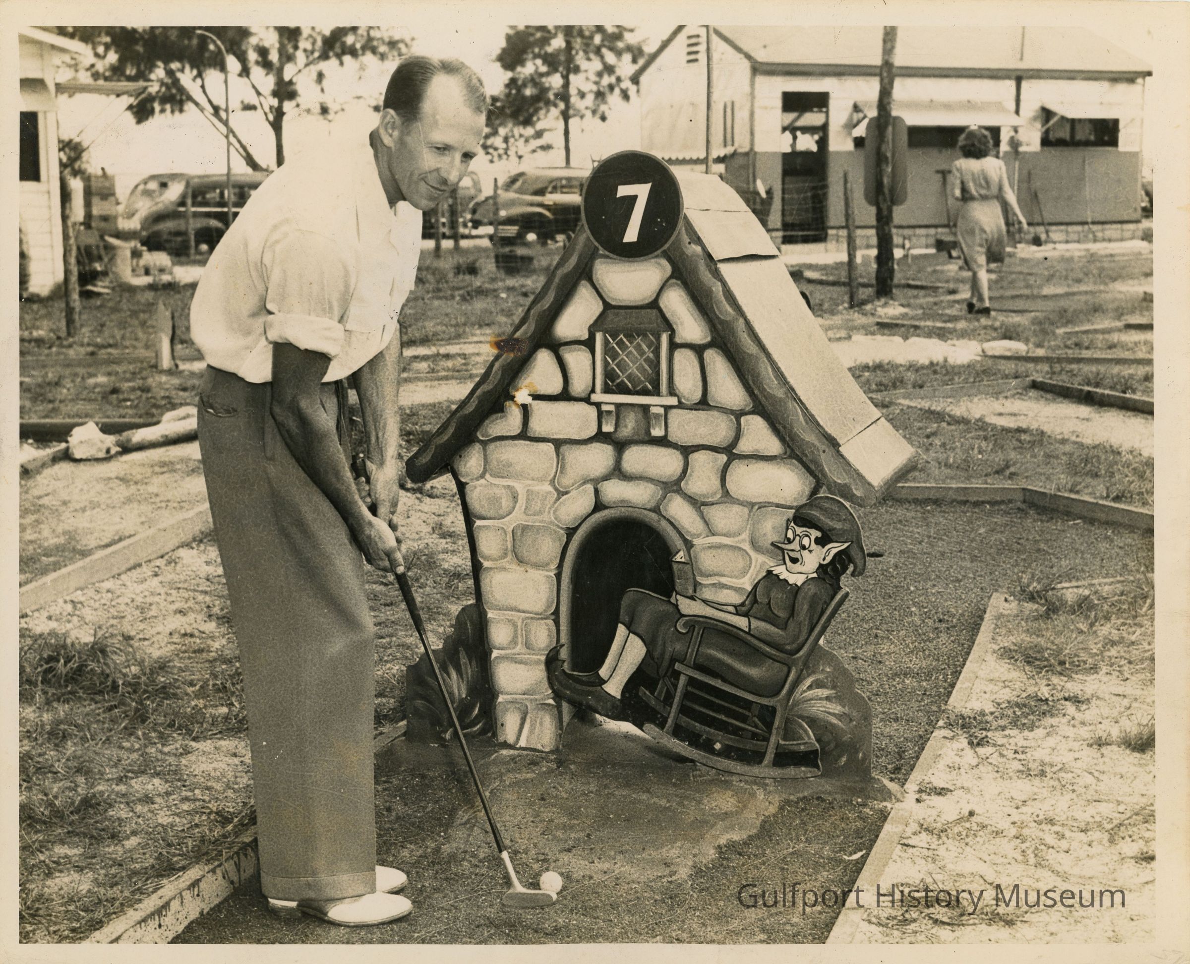 A black and white photograph of Howard Snyder at Gremlin Golf Course at 5513 Shore Blvd S. Snyder, the owner and designer, is aiming for a putt at hole 7.