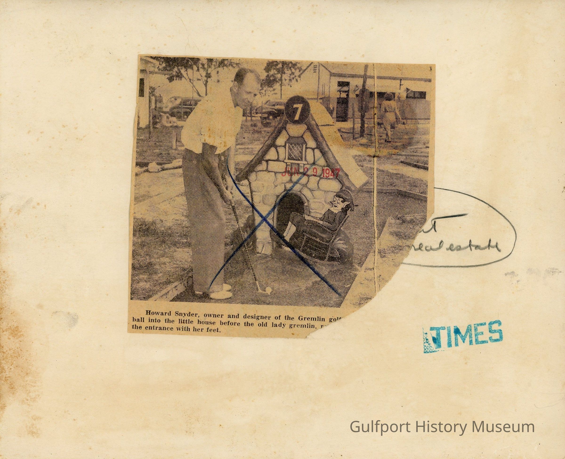 Howard Snyder, owner and designer of the Gremlin golf [?] ball into the little house before the old lady gremlin, [?] the entrance with her feet.