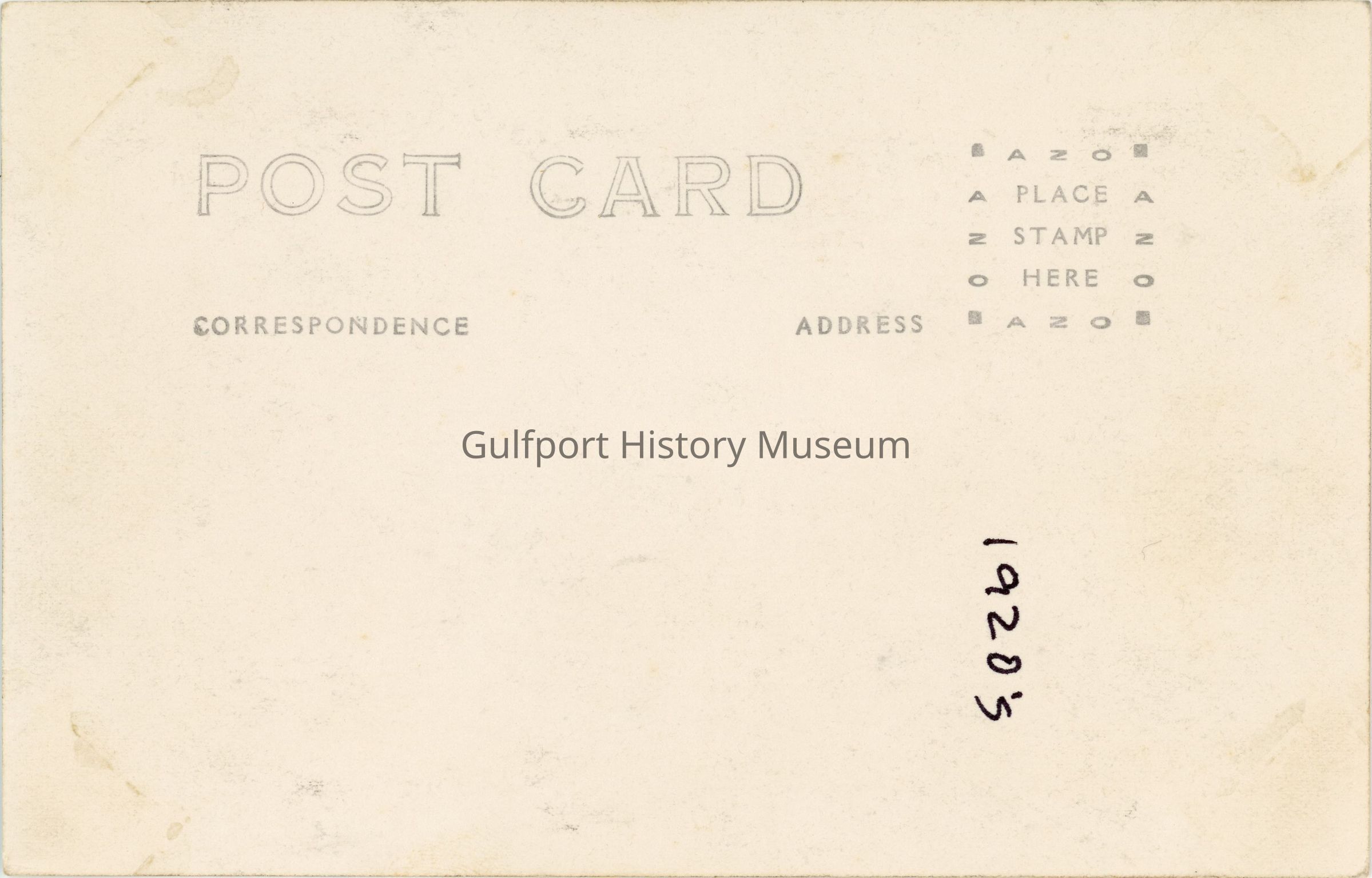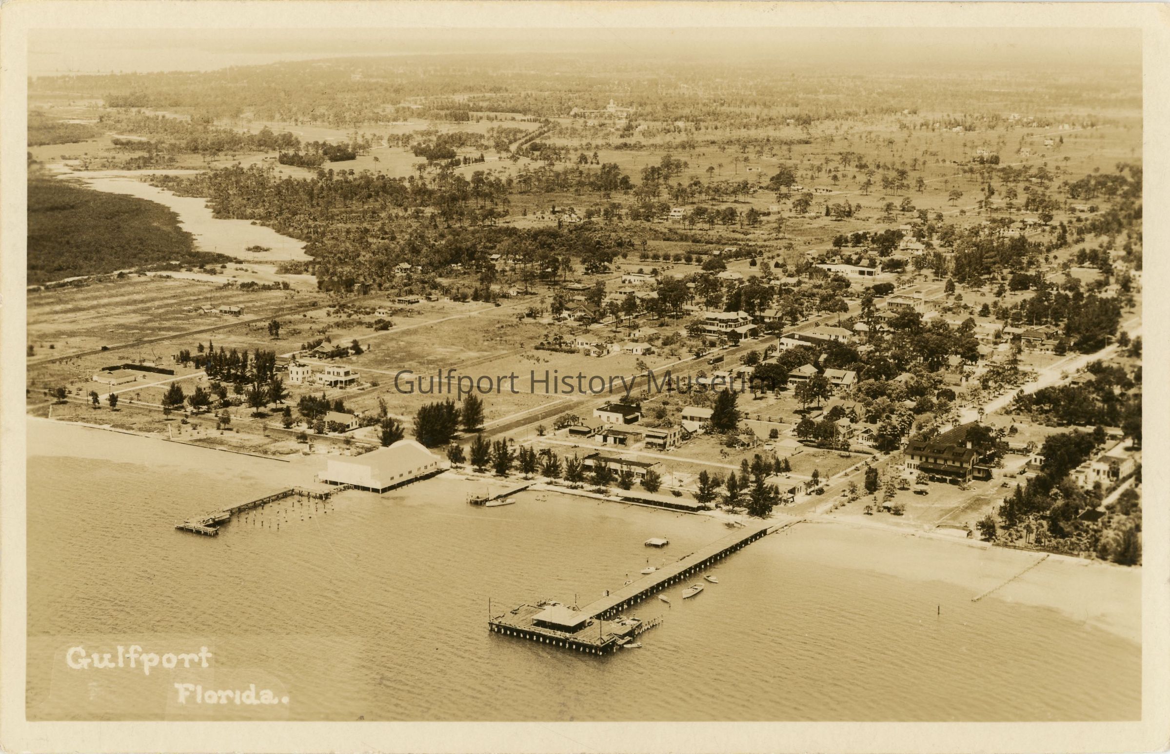 A black and white photograph postcard showing an aerial view of Gulfport and its shore, including the pier, the second Gulfport Casino, and the ferry dock. The Boca Ciega Inn and Bayview Hotel are visible, as well as the Rolyat Hotel (now Stetson University College of Law) in the distance.