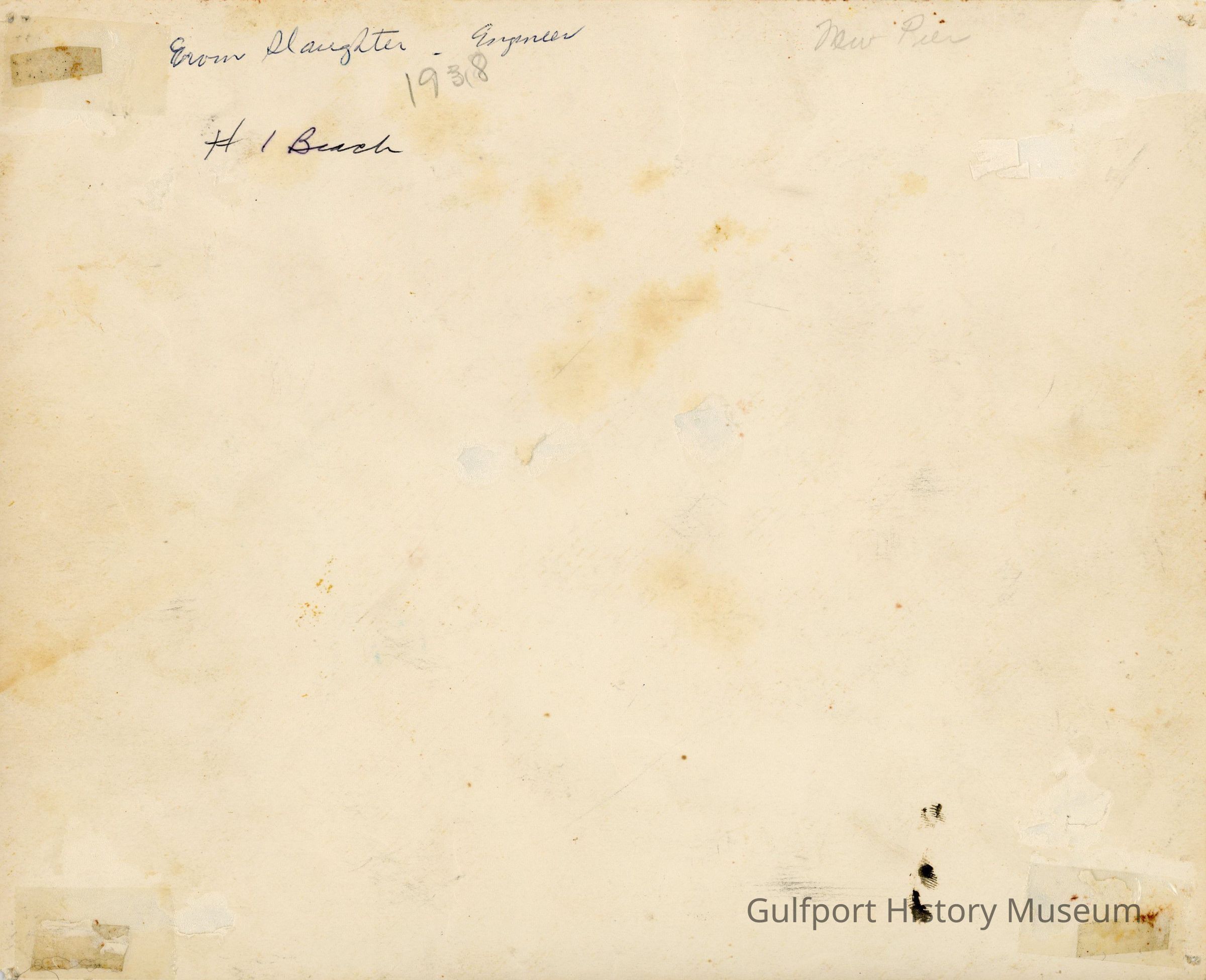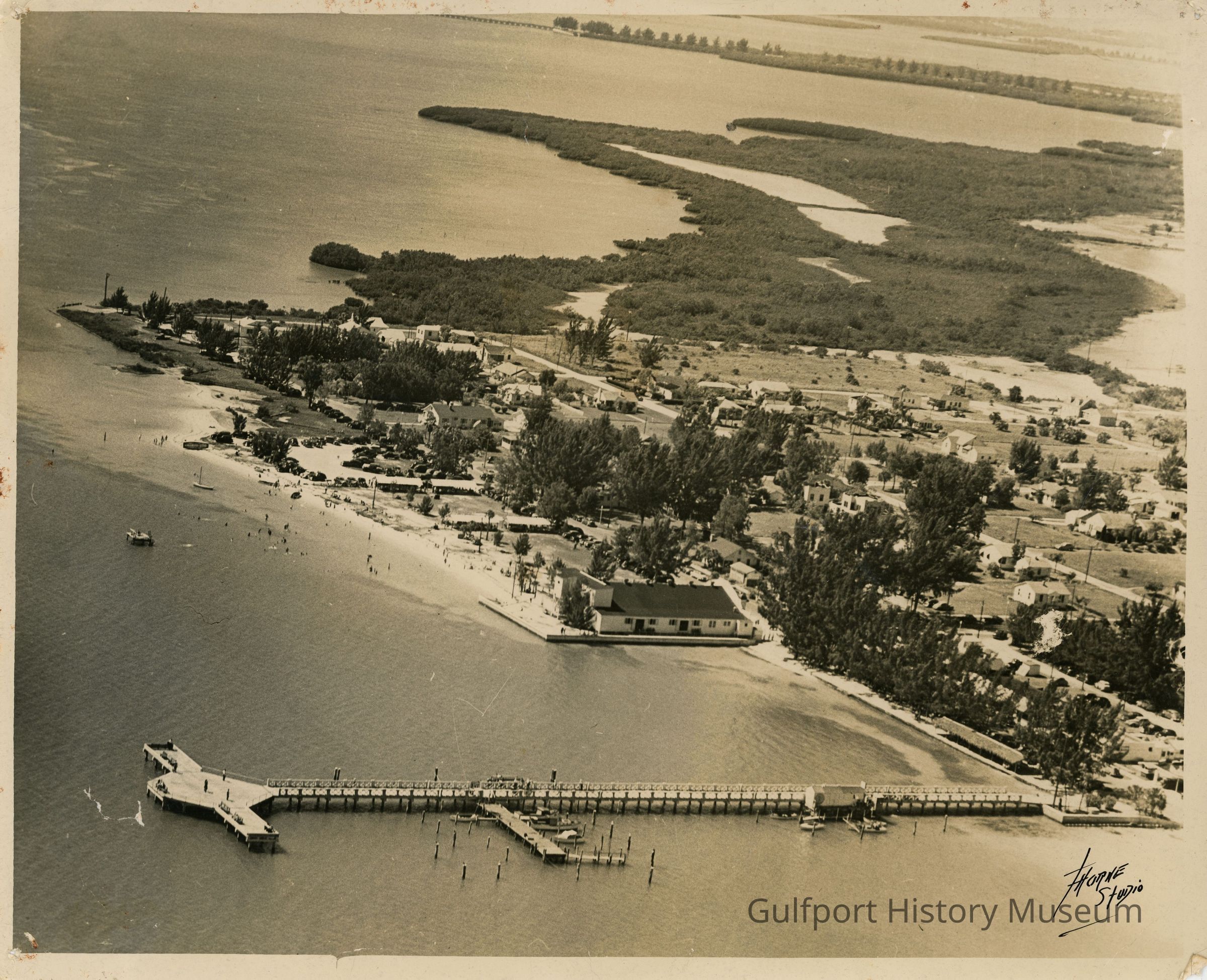 "Gulfport pier in 1938, the third pier to be built at the foot of 54th street. The first was a wooden pier built in 1907 by E.E. Wintersgill, who was elected the first mayor of Gulfport after its incorporation as a town in 1910. The first public pier, also of wood, excited from 1918 to 1933. This steel and concrete pier was built in 1934-1935 as a WPA project and remained until demolished in 1982. The photo looks west past the Casino and Gulfport Beach to the area that is now Town Shores and the Pasadena Yacht and Country Club. This view, taken by photographer Harry Thorne, was made into a black and white postcard."