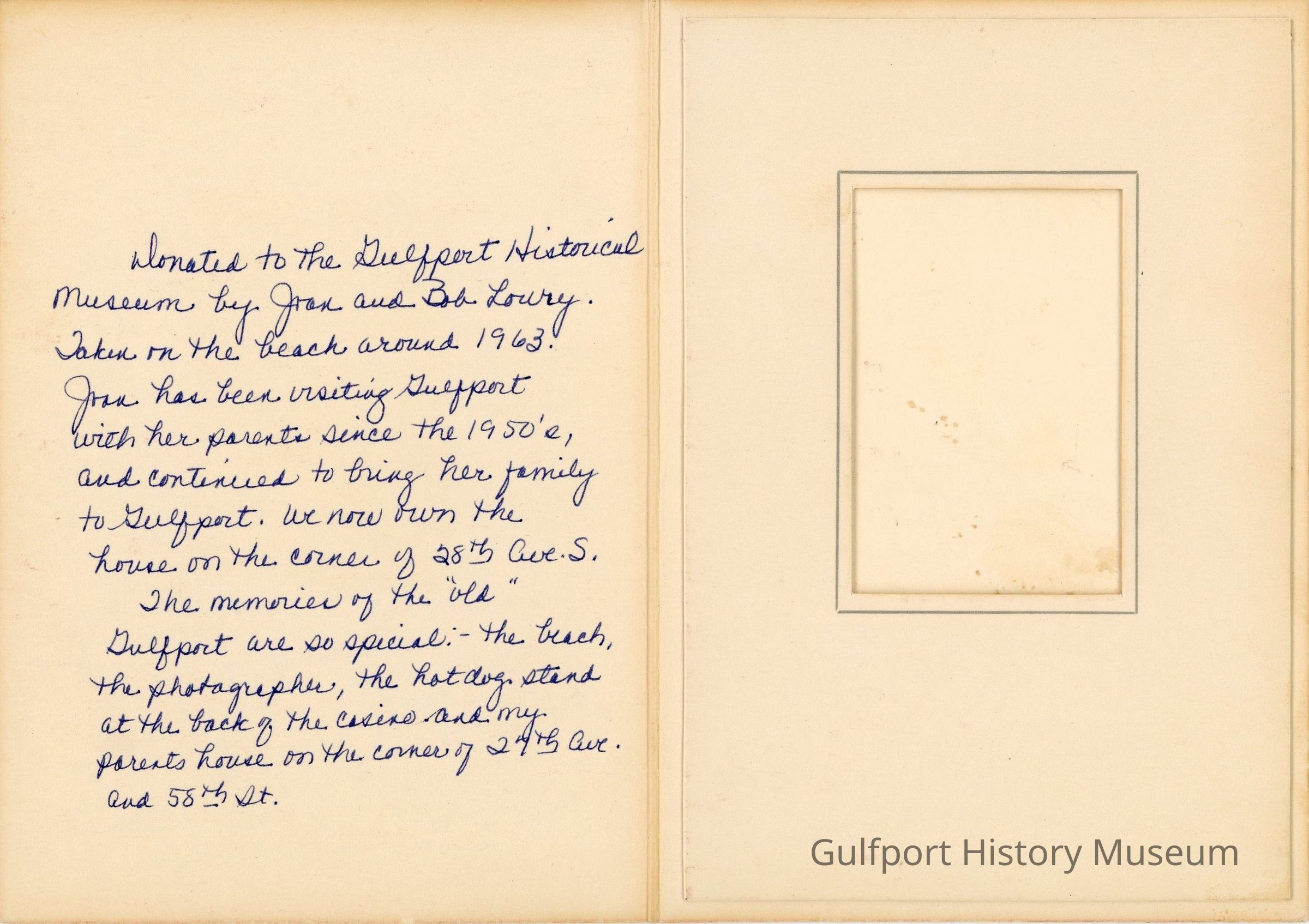 Donated to the Gulfport Historical Museum by Fran and Bob Lowry. Taken on the beach around 1963. Fran has been visiting Gulfport with her parents since the 1950's, and continues to bring her family to Gulfport. We now own the house on the corner of 28th Ave S.