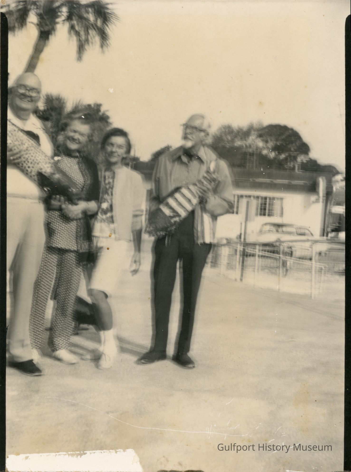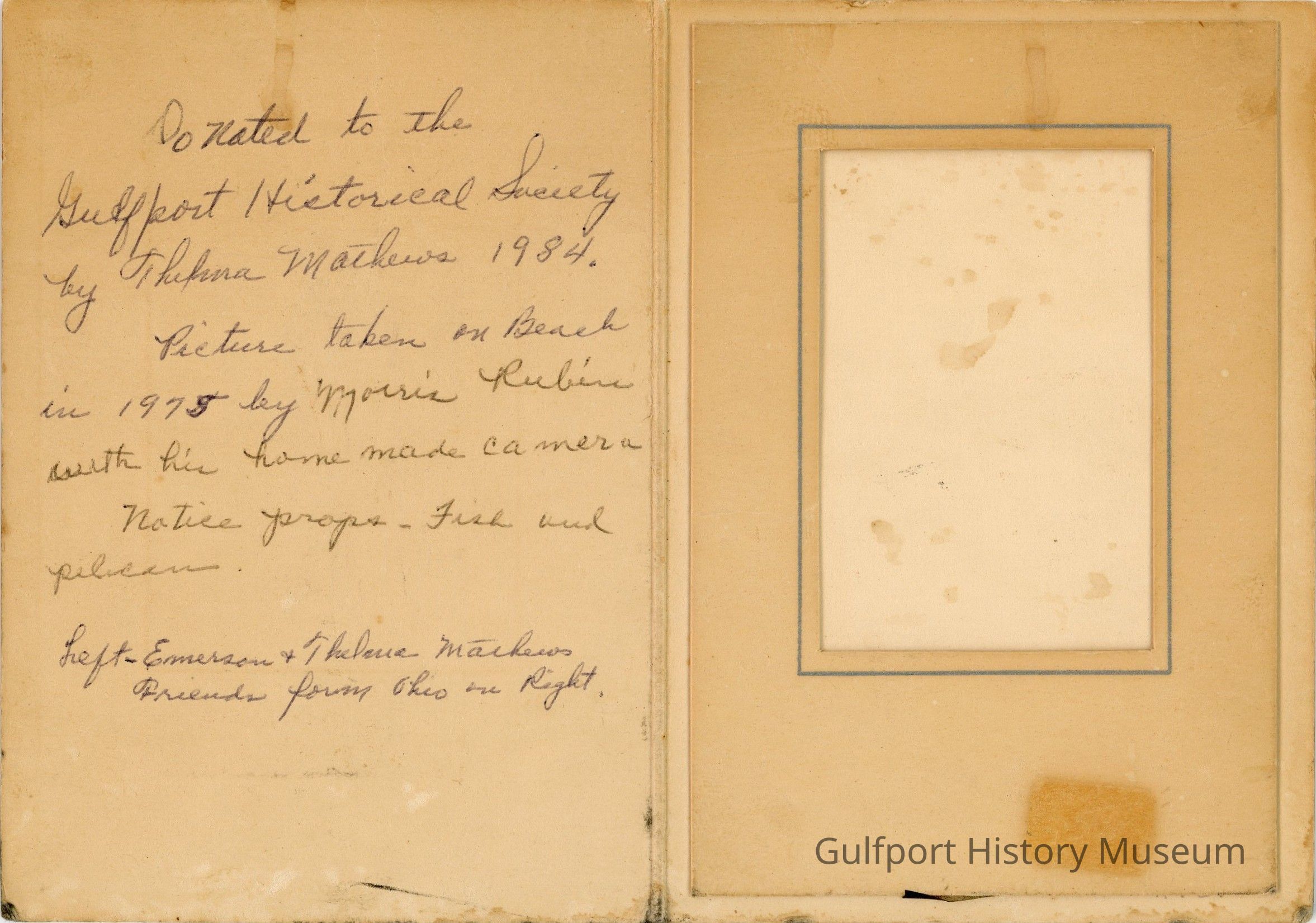 Donated to the Gulfport Historical Society by Thelma Mathews 1984. Picture taken on Beach in 1975 by Morris Rubin with his homemade camera. Notice props - fish and pelican. Left - Emerson + Thelma Mathews Friends from Ohio on right