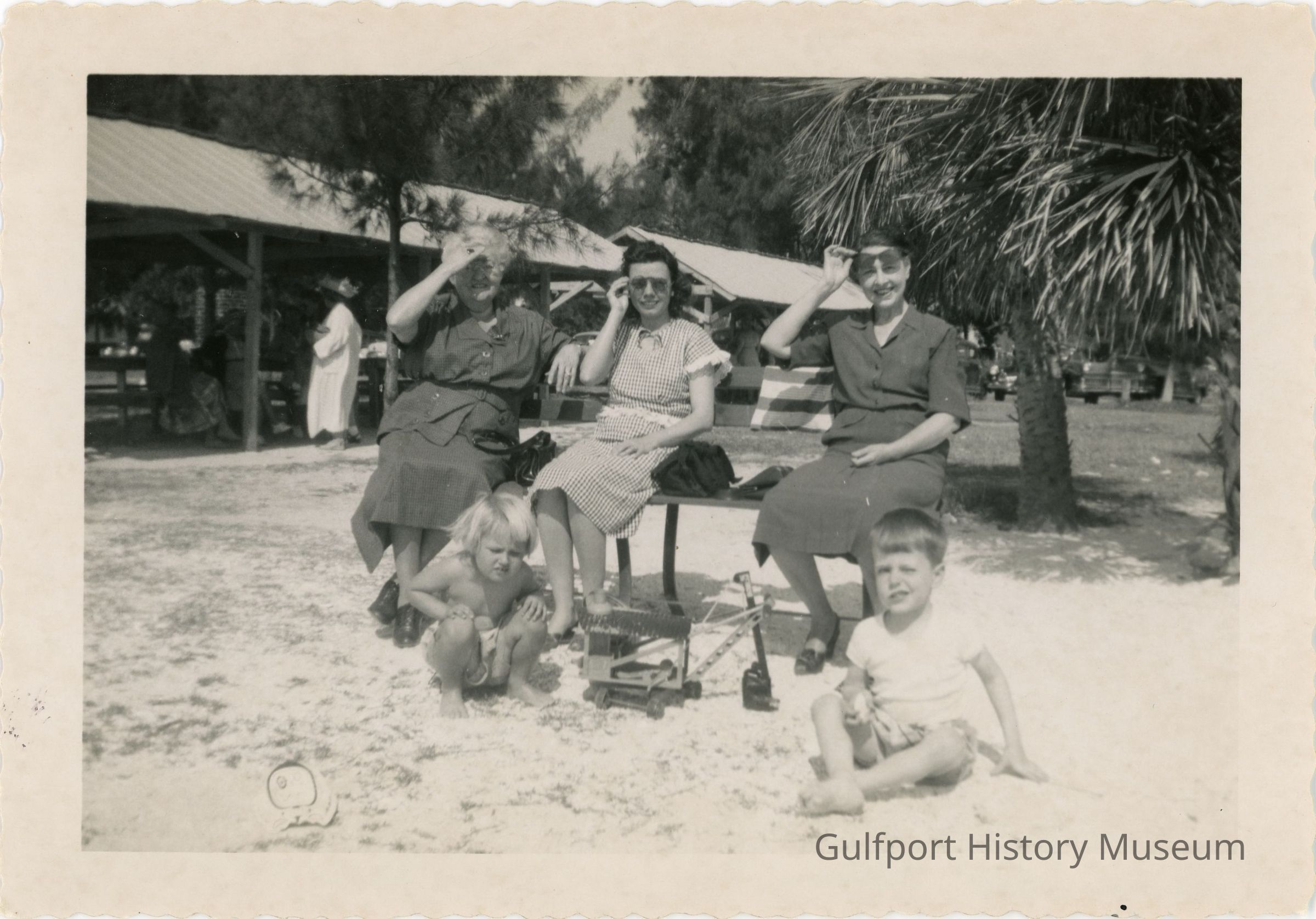 A black and white photograph of three women and two children at Gulfport Beach. The women sit on a bench and the children sit on the sand with toys. Palm trees, cars, picnic shelters, and other people are in the background.