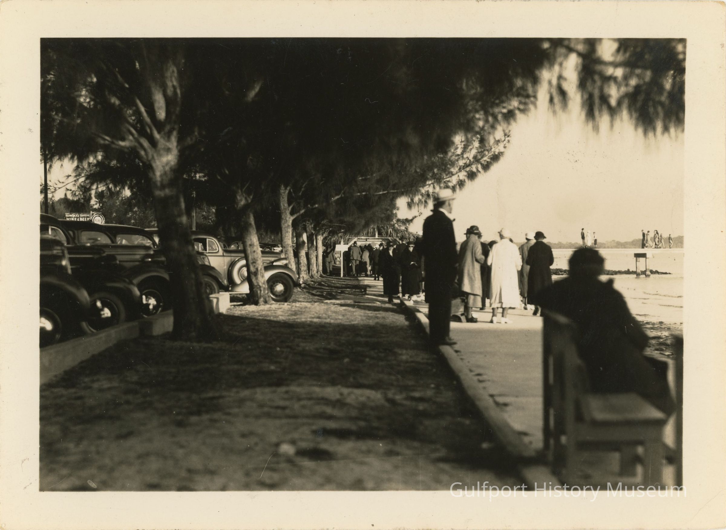 A black and white photograph showing people walking on the sidewalk along the shore at Gulfport Beach. Trees and dirt separate the sidewalk from the road which is lined with parked black cars. Someone sits on a bench in the foreground. The cabana shelter is visible at the end of the sidewalk in the background.
