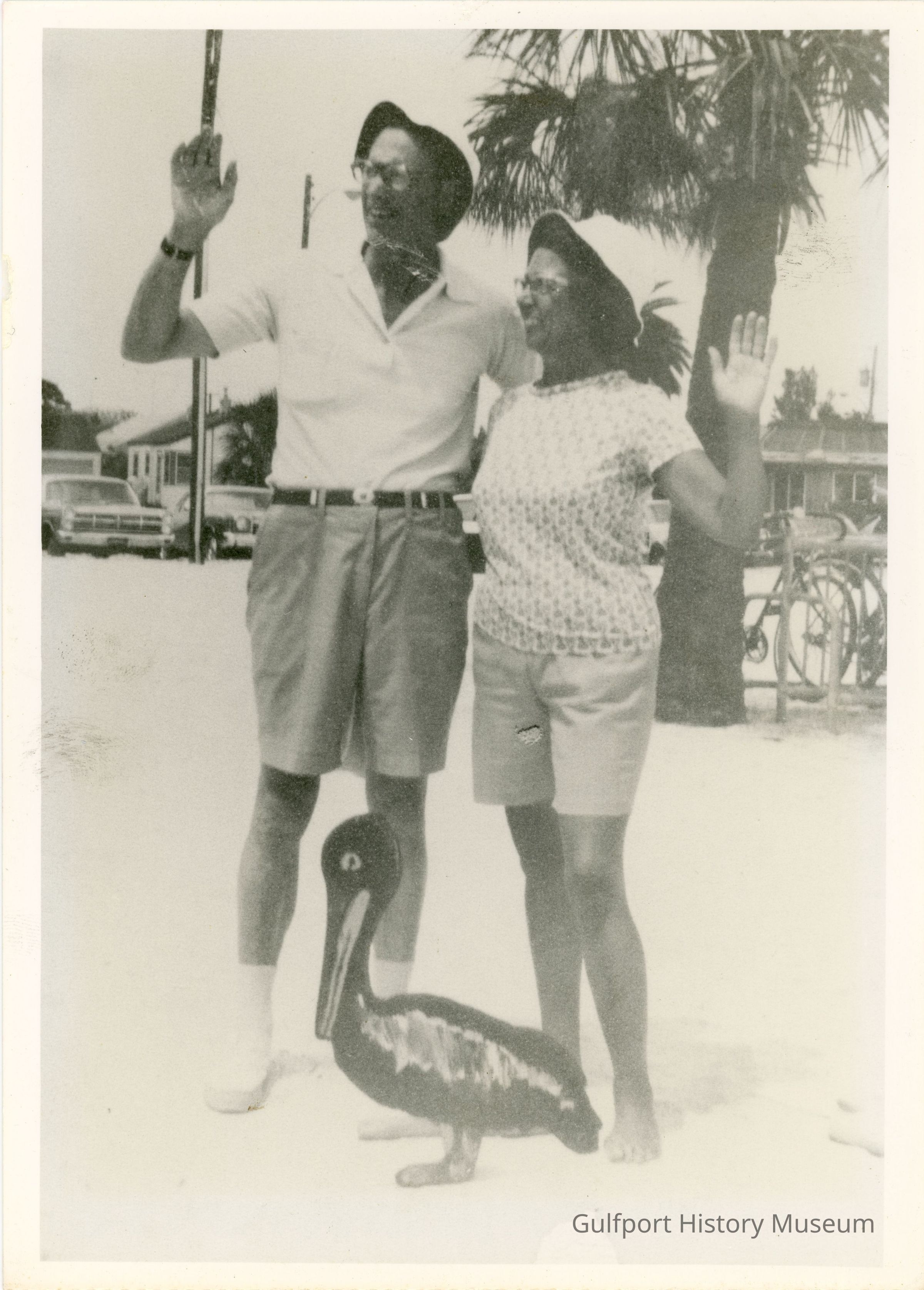 A black and white photographic print of a man and a woman standing on Gulfport beach. They are both wearing bucket hats. They are looking at and waving to someone or something out of frame. The background consists on parked cars, buildings, a palm tree, and a bicycle rack with bicycles. A small, wooden pelican prop sits at their feet in the foreground.