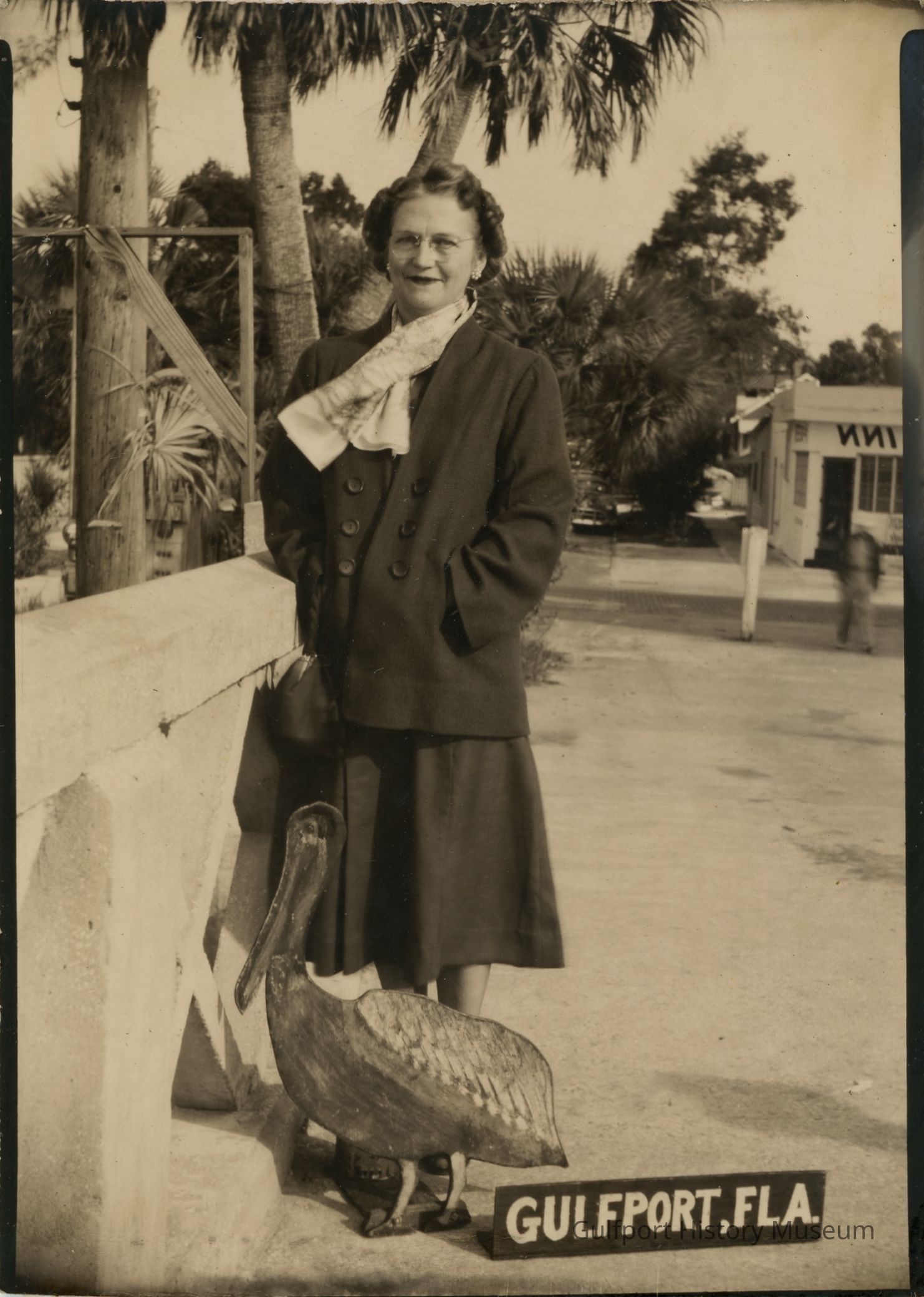 DIGITAL ONLY -- A black and white mirrored photograph of [a woman] standing at Gulfport Beach with a pelican prop. She wears a winter coat and scarf. The Sail Inn is visible behind her. "GULFPORT, FLA."
