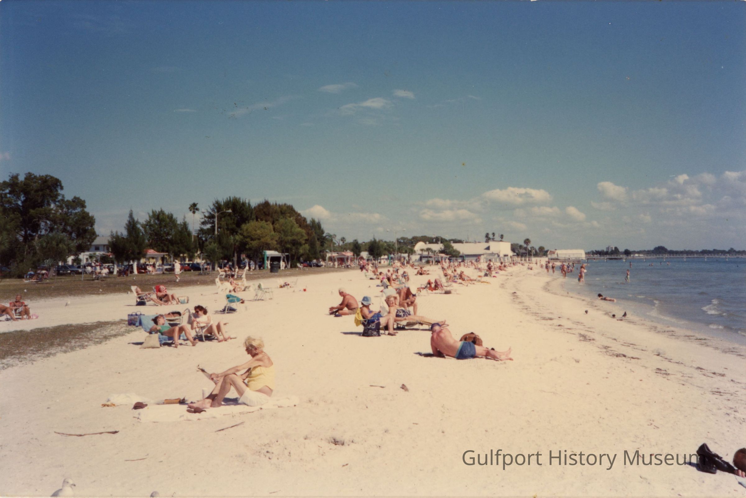 A color photograph of the shoreline at Gulfport Beach. Beachgoers are spread out along the beach down to the Gulfport Casino. There are some people standing and swimming in Boca Ciega Bay.