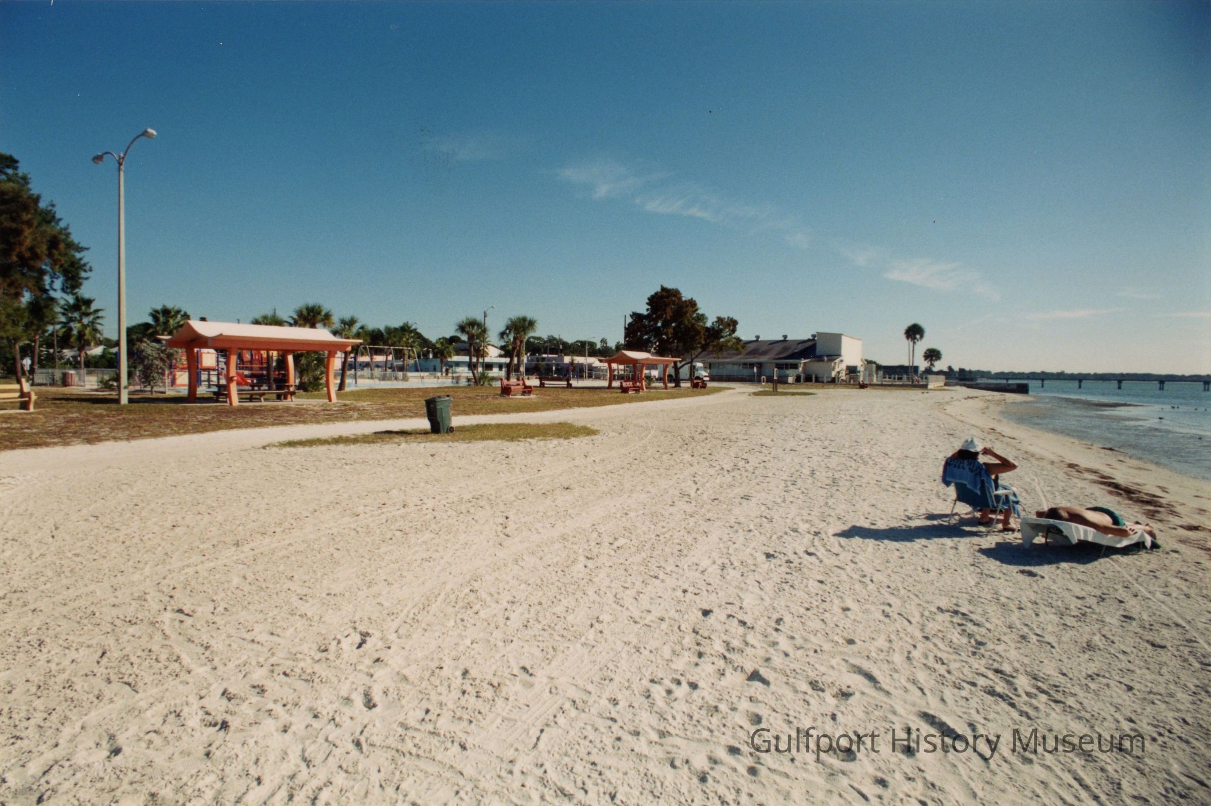 A color photograph of Gulfport Beach looking east. The Gulfport Casino can be seen in the background, as well as part of the Municipal Pier, volleyball courts, and a playground. Two white and salmon-colored picnic shelters stand along the beach in the grass. In the foreground, two people are sunbathing on beach chairs.