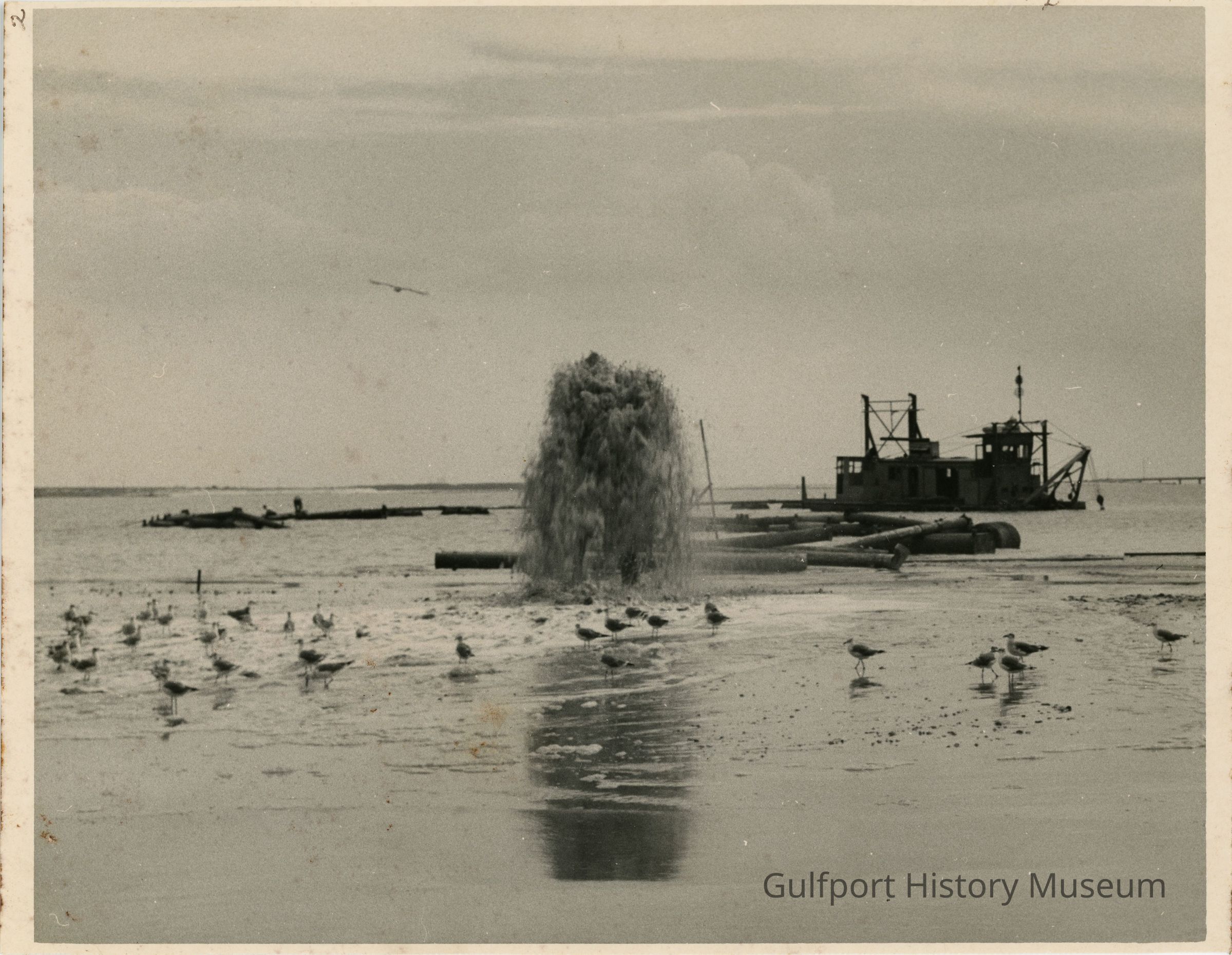 A black and white photograph of dredging at Gulfport Beach. A dredging vessel and pipes can be seen on the water of Boca Ciega Bay. Seagulls walk along the shore by the eruption of sediment and seawater.