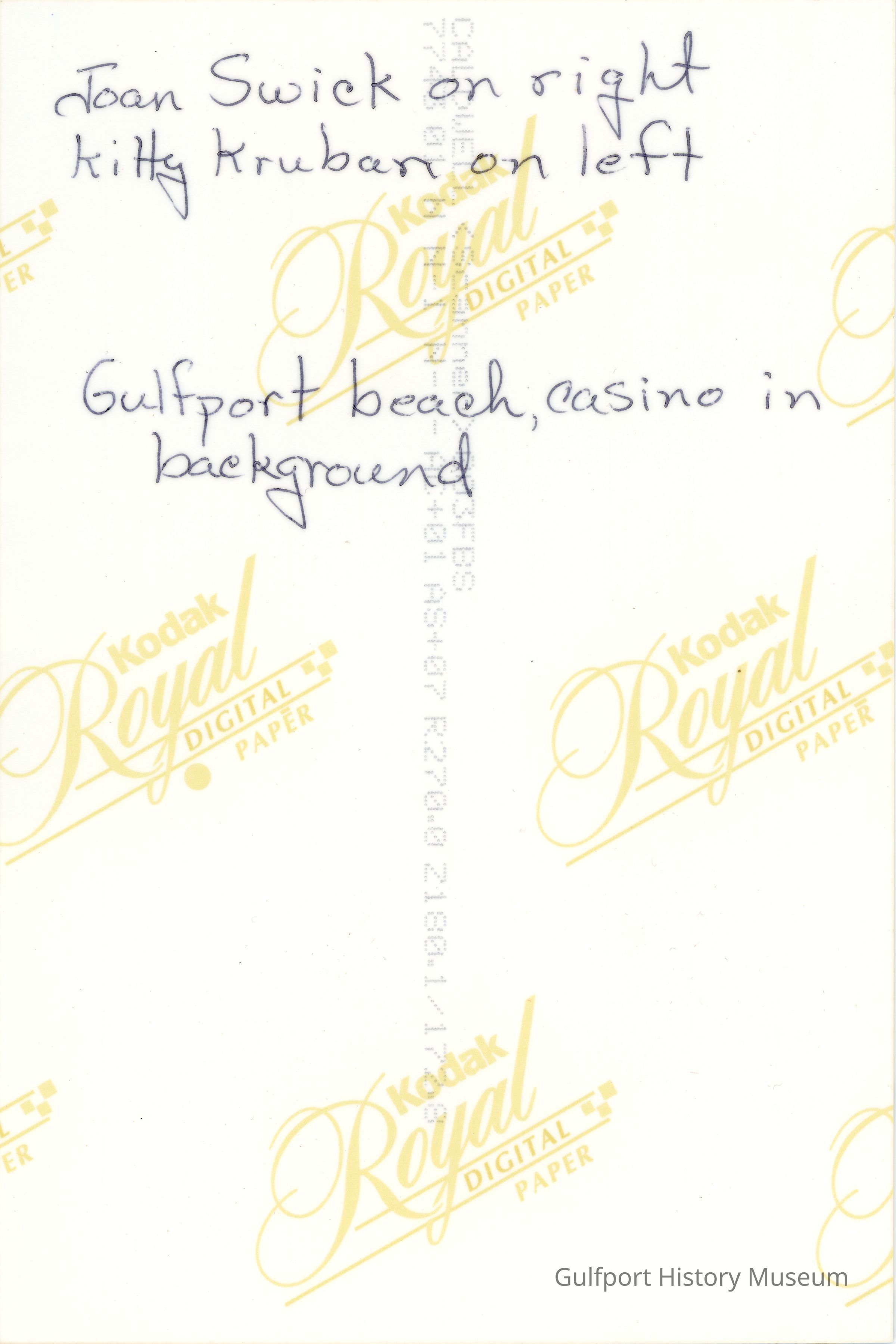 Joan Swick on right / Kitty Kruban on left / Gulfport beach, casino in / background CALDWELL <Scanner> Q03FBS 7743 01 N N-1 N--- AC+01 AS+07 R270.0 Z180.1/172.8 Kodak Royal DIGITAL PAPER