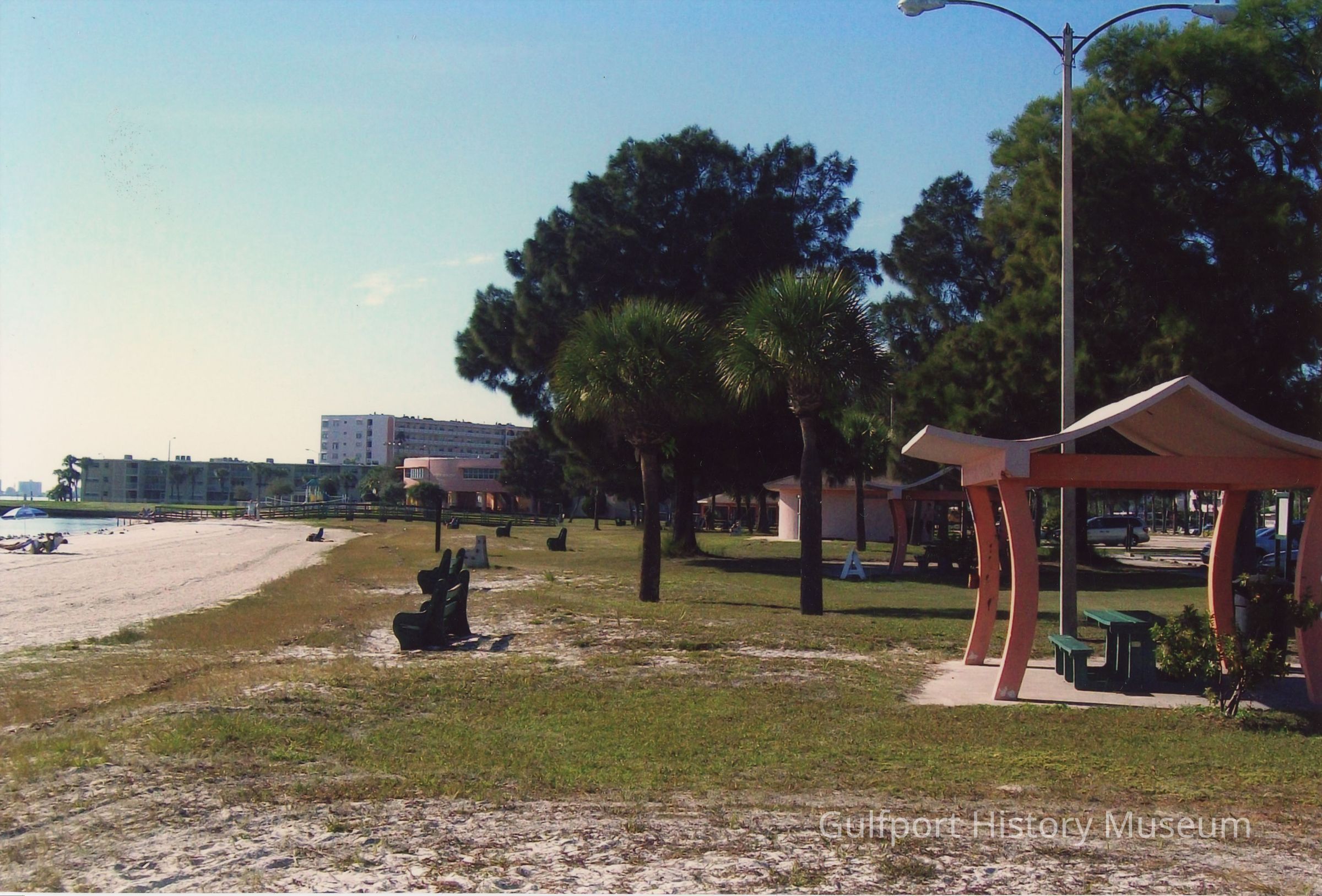 A photo of Gulfport Beach looking west. A white and salmon-colored shelter stands in the foreground, with an identical one behind it. Under the shelters are a green picnic tables. Public restrooms, the Gulfport Recreation Center, and Town Shores can be seen in the distance. Green benches line the beach on the grass.