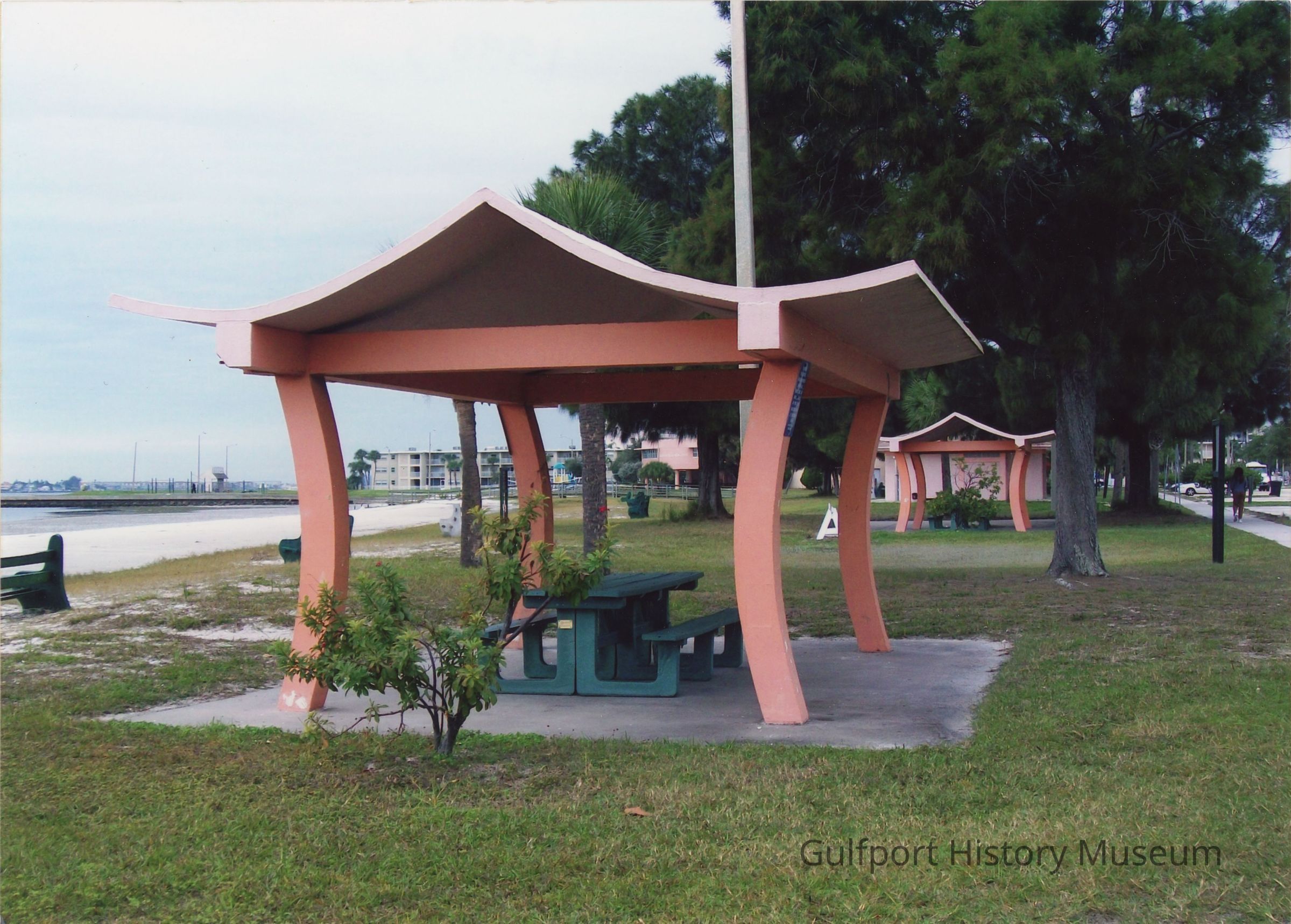 A photo of Gulfport Beach looking west. A white and salmon-colored shelter stands in the foreground, with an identical one behind it. Under the shelters are a green picnic tables. Public restrooms, the Gulfport Recreation Center, and Town Shores can be seen in the distance. Green benches line the beach on the grass.