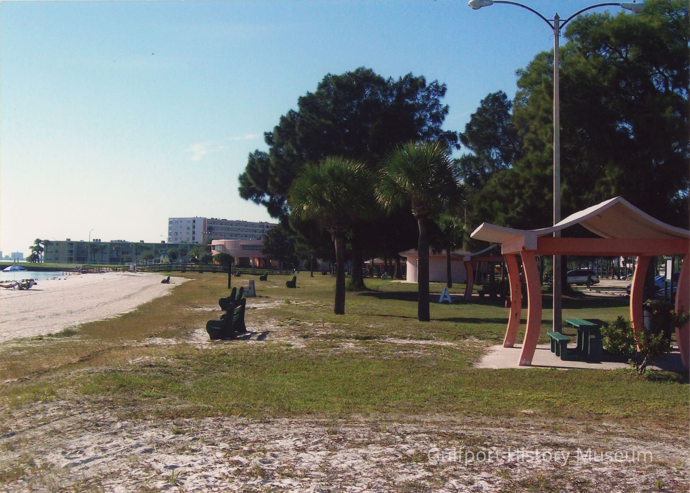 A photo of Gulfport Beach looking west. A white and salmon-colored shelter stands in the foreground, with an identical one behind it. Under the shelters are a green picnic tables. Public restrooms, the Gulfport Recreation Center, and Town Shores can be seen in the distance. Green benches line the beach on the grass.