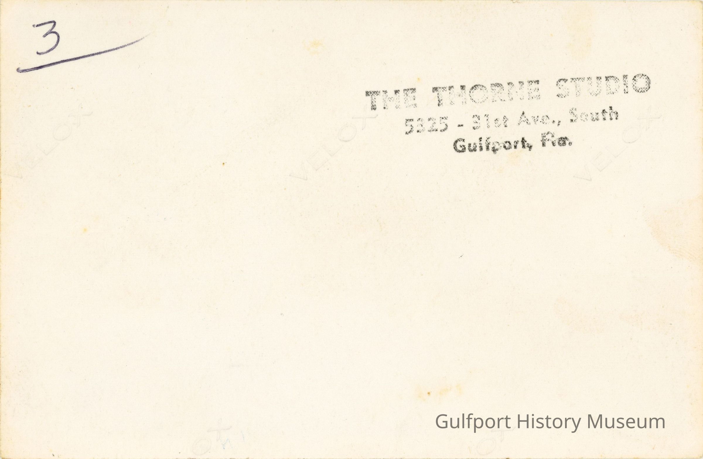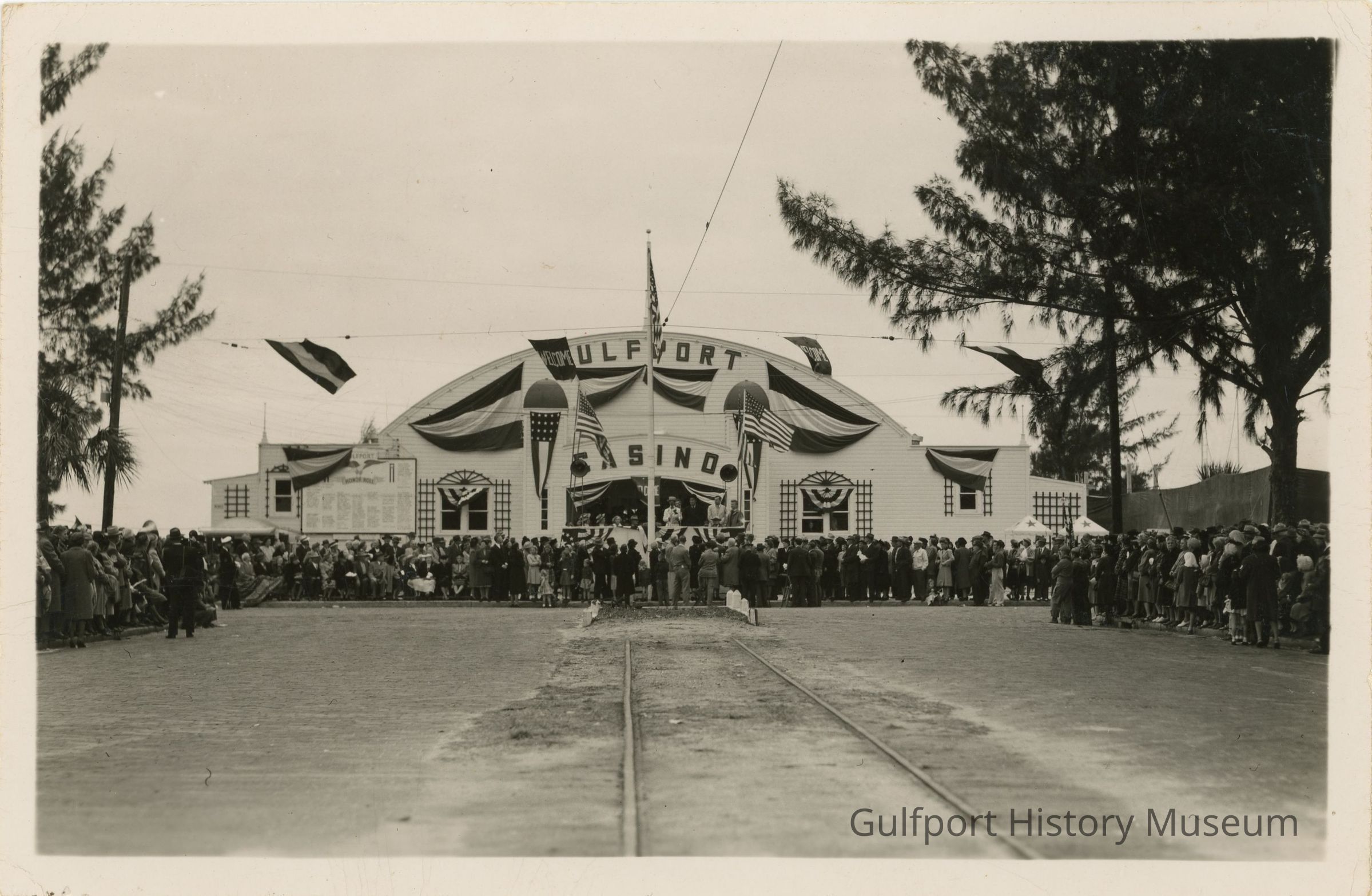 A black and white photograph of the Gulfport Casino from Beach Blvd. The building is decorated in various patriotic banners and bunting and several American flags are raised. The sidewalks down Beach Blvd and in front of the building are full of people. Trolley tracks run down the road to the front of the building.